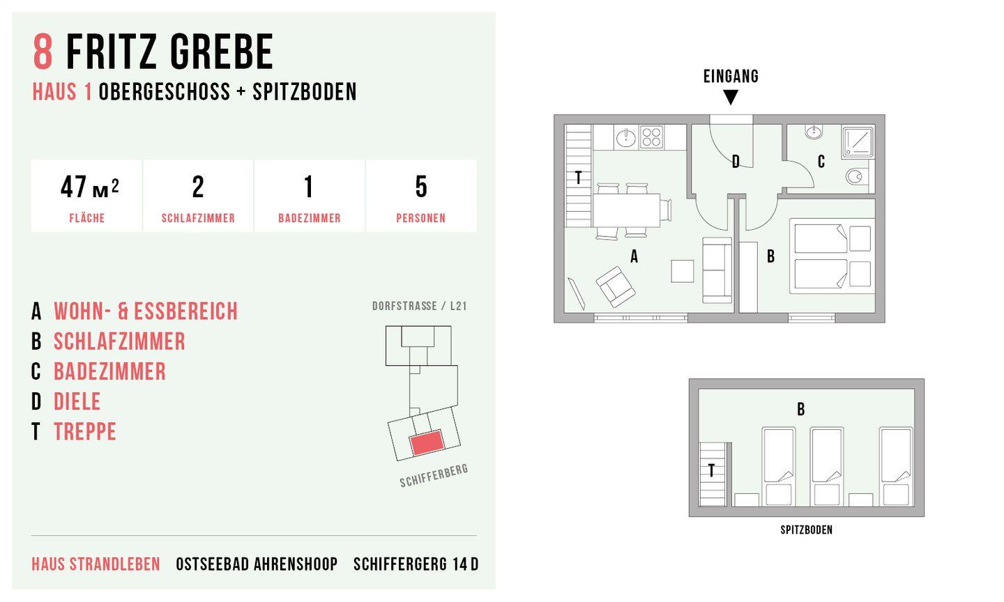 Im Obergeschoss befinden sich der Wohnbereich mit gemütlicher Sitz- und Essecke, eine separate Küchenzeile, ein Schlafzimmer mit Doppelbett (180x200 cm) und ein Bad mit Dusche/WC. Das Dachgeschoss verfügt über ein offenes zweites Schlafzimmer mit drei Einzelbetten. Vom Schlafzimmer hast du einen kleinen Ausblick auf die Ostsee. Im Preis inklusive ist die Nutzung des Wellnessbereiches im Untergeschoss. Hier befinden sich ein Schwimmbad, eine Saunalandschaft, ein Ruheraum sowie Kneippfußbäder und Massageduschen.
