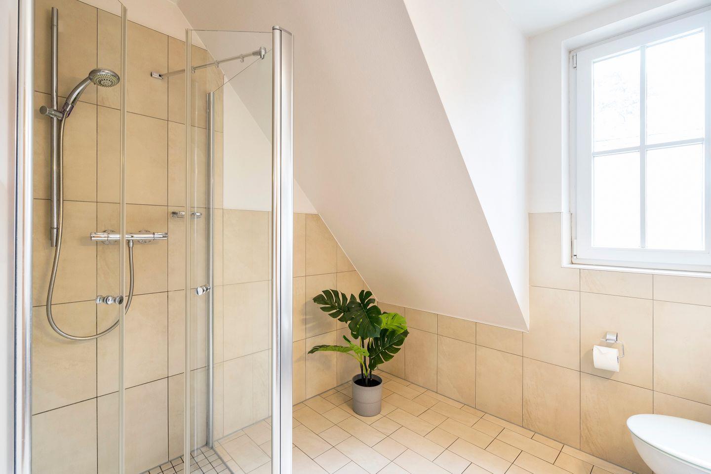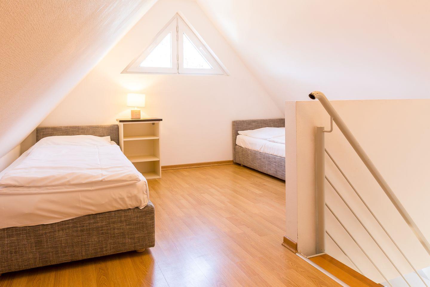 Im Obergeschoss befinden sich der Wohnbereich mit gemütlicher Sitz- und Essecke, eine offene Küchenzeile, ein Schlafzimmer mit Doppelbett (180x200 cm) und ein Bad mit Dusche/WC. Das Dachgeschoss verfügt über ein offenes zweites Schlafzimmer mit drei Einzelbetten. Von hier hast du einen kleinen Ausblick auf die Ostsee. Im Preis inklusive ist die Nutzung des Wellnessbereiches im Untergeschoss. Hier befinden sich ein Schwimmbad, eine Saunalandschaft, ein Ruheraum sowie Kneippfußbäder und Massageduschen.