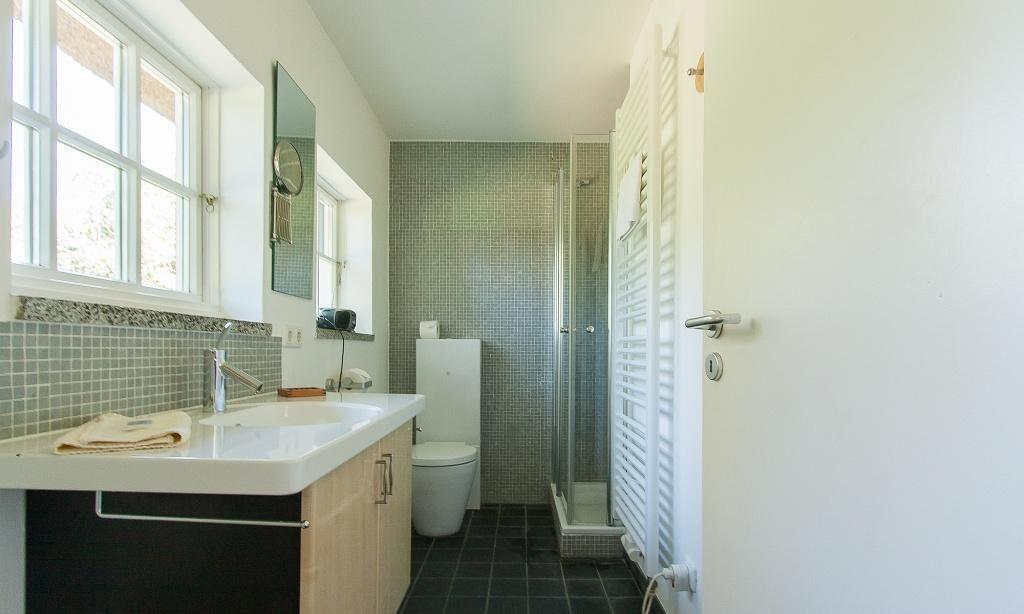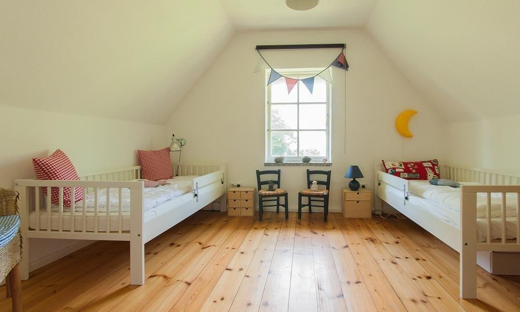 Im Erdgeschoss befindet sich das Esszimmer mit großem Esstisch, von hier aus hast du einen traumhaften Blick in den Garten. Die Küchenzeile ist im Flur integriert. Das angrenzende Schlafzimmer ist mit einem Doppelbett (180er Breite) ausgestattet. Weiterhin findet ein Bad mit Dusche/WC Platz. Eine etwas steilere Treppe führt direkt ins Dachgeschoss. Hier erwartet dich ein kleiner Wohnraum mit einer gemütlichen Sitzecke sowie ein Kinder-Schlafzimmer mit zwei Einzelbetten.