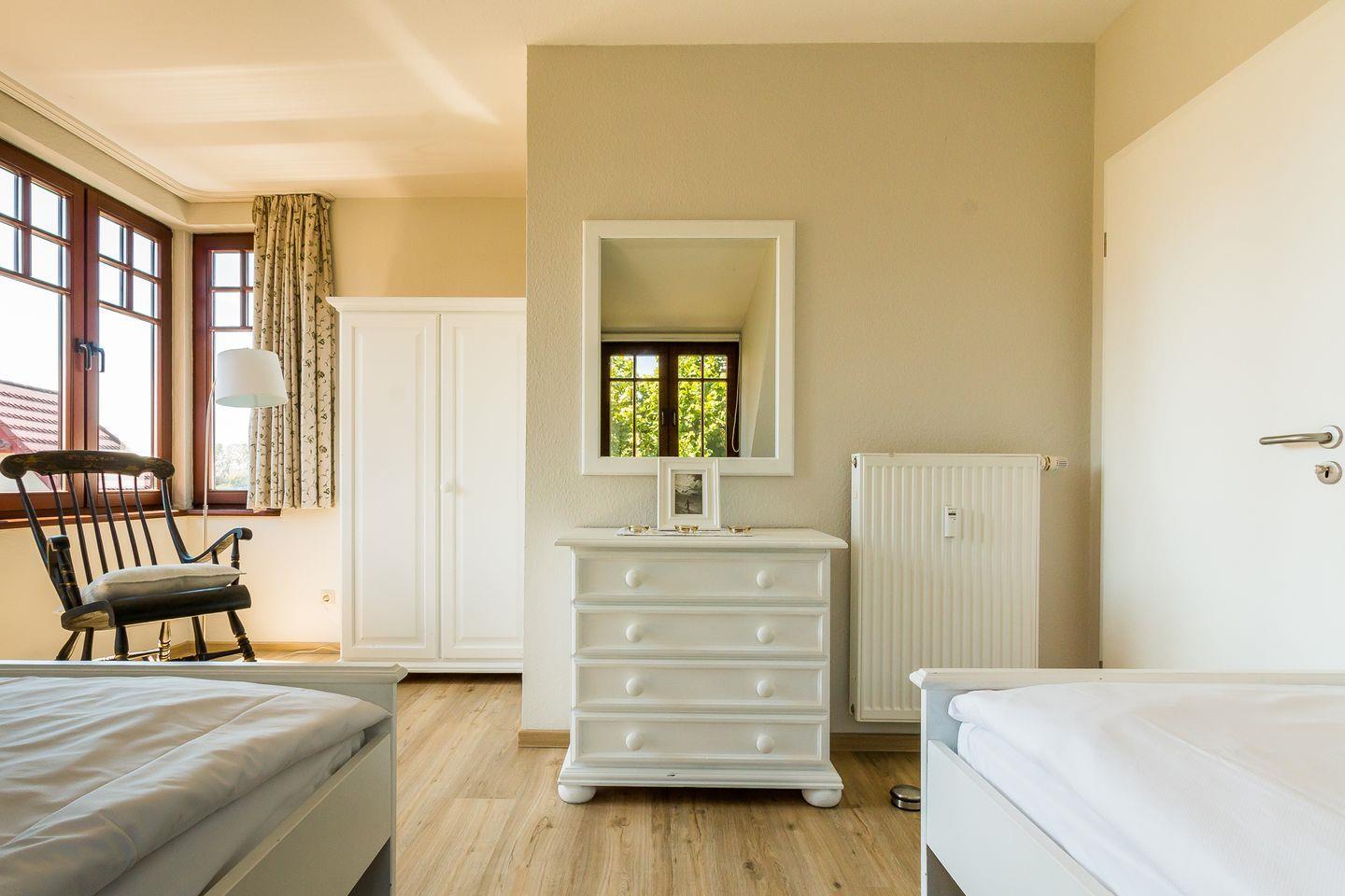 Im Erdgeschoss empfängt dich der gemütlich eingerichtete Wohnraum mit einer Sitzecke am Kaminofen. Der einladende Essbereich im sonnigen Erker bietet ausreichend Platz für sechs Personen. Die große Wohnküche ist funktional ausgestattet und lässt beim Kochen keine Wünsche offen. Ein Gäste-WC sowie ein Abstellraum finden ebenfalls in der unteren Etage Platz. Das Obergeschoss verfügt über ein Schlafzimmer mit einem Doppelbett und bietet einen traumhaftem Blick über Wiesen und Felder. Das zweite Schlafzimmer ist mit zwei Einzelbetten ausgestattet und zum Garten hin gelegen. Vom Erker aus hast du einen kleinen Ausblick auf den Bodden. Weiterhin steht den Gästen auf dieser Etage ein großzügiges Bad mit Dusche/WC zur Verfügung. Das Sofa im Wohnbereich bietet eine zusätzliche Aufbettung für zwei Personen.