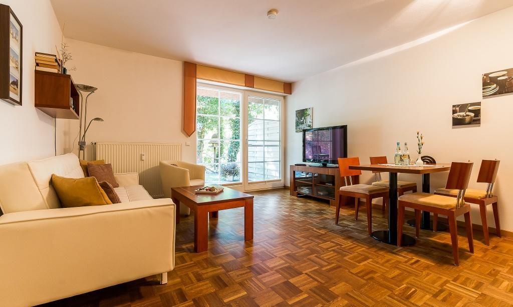 Die Erdgeschoss-Wohnung hat einen gemütlichen Wohnraum mit moderner Sitzecke und großzügigen TV. Über das Wohnzimmer betrittst du die dazugehörige Steinterrasse. Hier kannst du mit Blick ins Grüne entspannen und die Seele baumeln lassen. Auch die voll ausgestattete Küchenzeile und der Essbereich sind im Wohnraum integriert und sorgen für einen offenen und kommunikativen Wohncharakter. Das Schlafzimmer ist mit einem Doppelbett und großem Kleiderschrank ausgestattet. Separat befindet sich das Bad mit Dusche/WC.