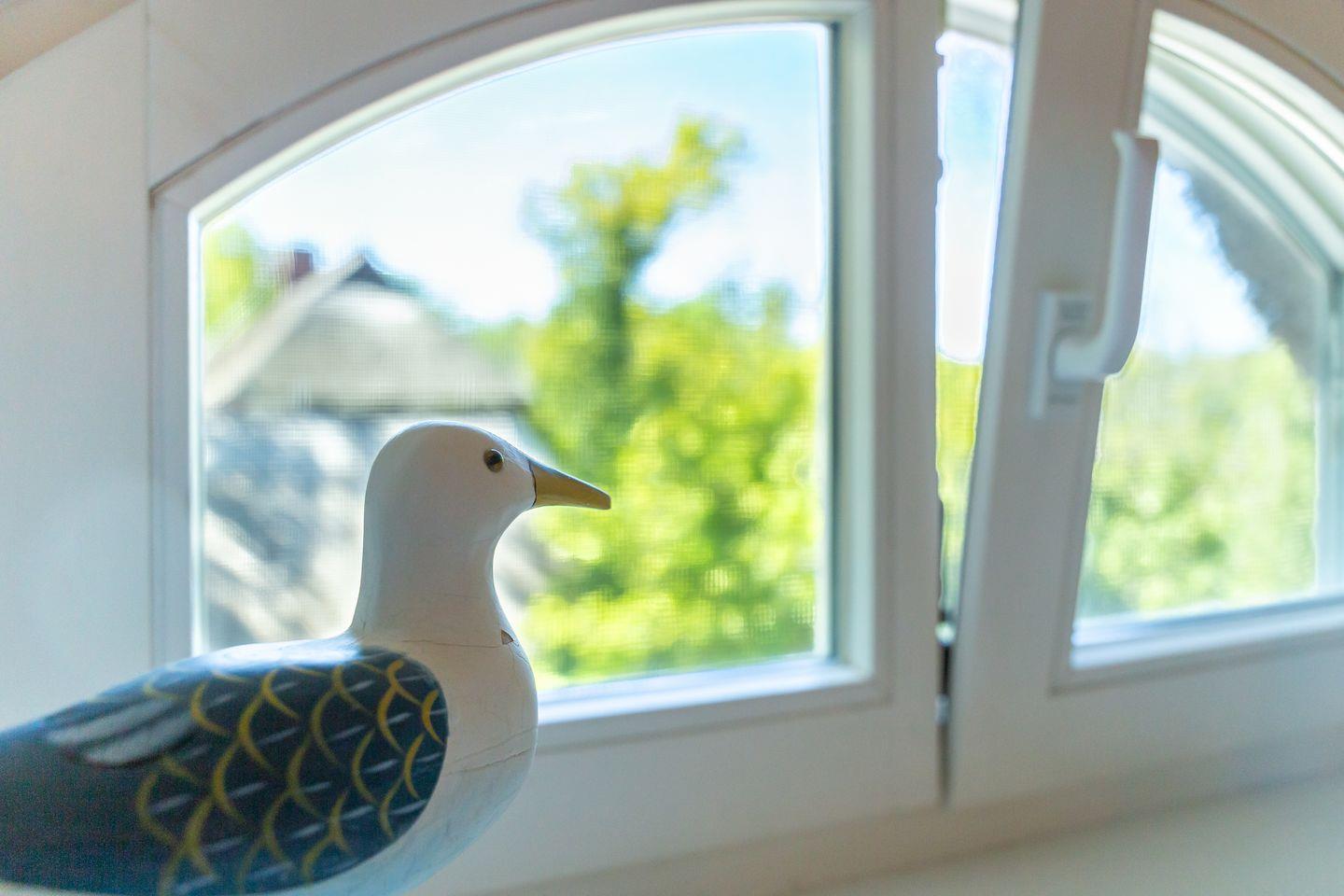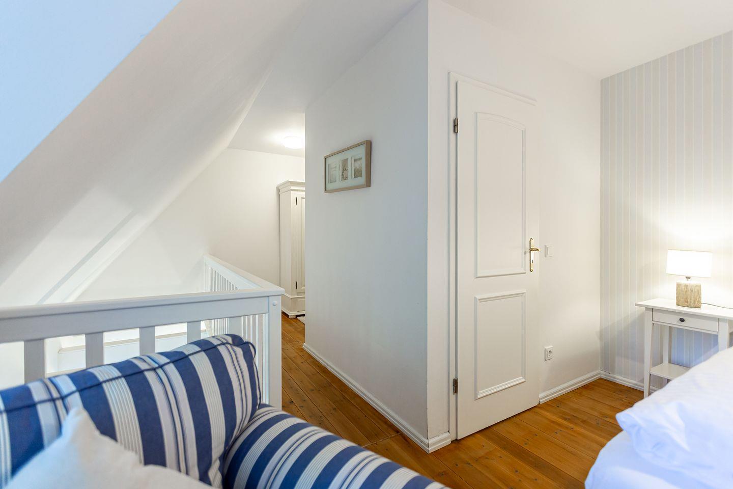 Wohn- und Küchenbereich, das schicke Bad sowie der Balkon mit grünem Ausblick befinden sich auf der ersten Etage. Über eine Treppe geht’s ins obere Schlafzimmer mit offener Empore. Von hier hast du nicht nur ein kuscheliges Refugium zum Träumen, sondern auch einen schönen Blick hinunter in den Wohnraum. Alles wirkt hier ruhig, klar und gleichzeitig wohlig warm – eine Wohnung zum Ankommen, Durchatmen und Wohlfühlen. Ideal für alle, die es modern, schick und trotzdem richtig gemütlich mögen. Zur Ferienwohnung gehört außerdem der PKW-Stellplatz Nr. 5.