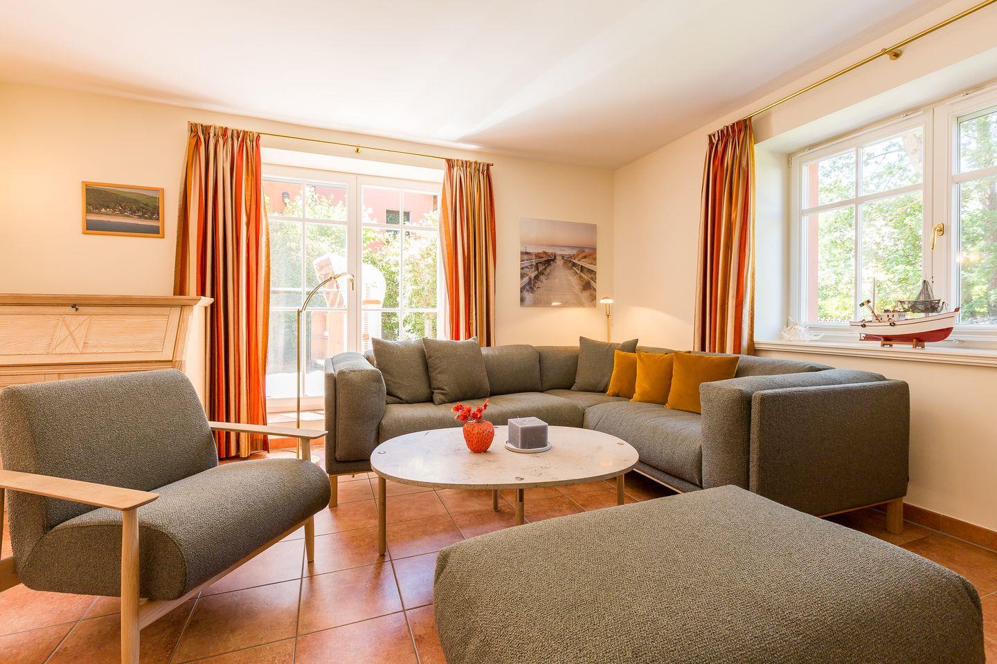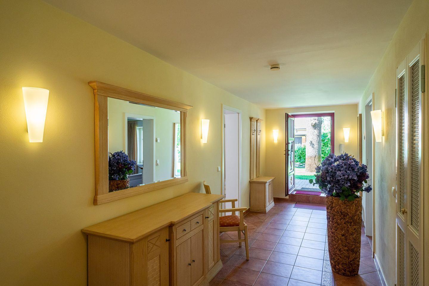 Die Fünf-Sterne-Wohnung verfügt über einen separaten Eingang und erstreckt sich über das gesamte Erdgeschoss des Hauses. Der Flur mit Garderobe führt dich geradezu in den einladenden Wohnraum. Hier erwartet dich eine gemütliche Sofalandschaft am Kamin und TV. Die hochwertig ausgestattete Küche mit Essbereich ist ebenfalls im Wohnraum integriert und bietet dir alles was das Kochherz begehrt. Des Weiteren verfügt die großzügige Wohnung über zwei Schlafzimmer im Landhaus-Stil, die jeweils mit Doppelbetten aus ausreichend Stauraum ausgestattet sind. Zwei moderne Bäder mit Dusche/WC und Bidet sowie eine eigene kleine Wellnessoase mit Sauna sorgen für zusätzlichen Urlaubskomfort. Eine fünfte Person kann über ein Zustellbett in einem der Schlafzimmer aufgebettet werden. Die Ferienwohnung verfügt zudem über Highspeed-Internet und eignet sich daher hervorragend für eine Workation.