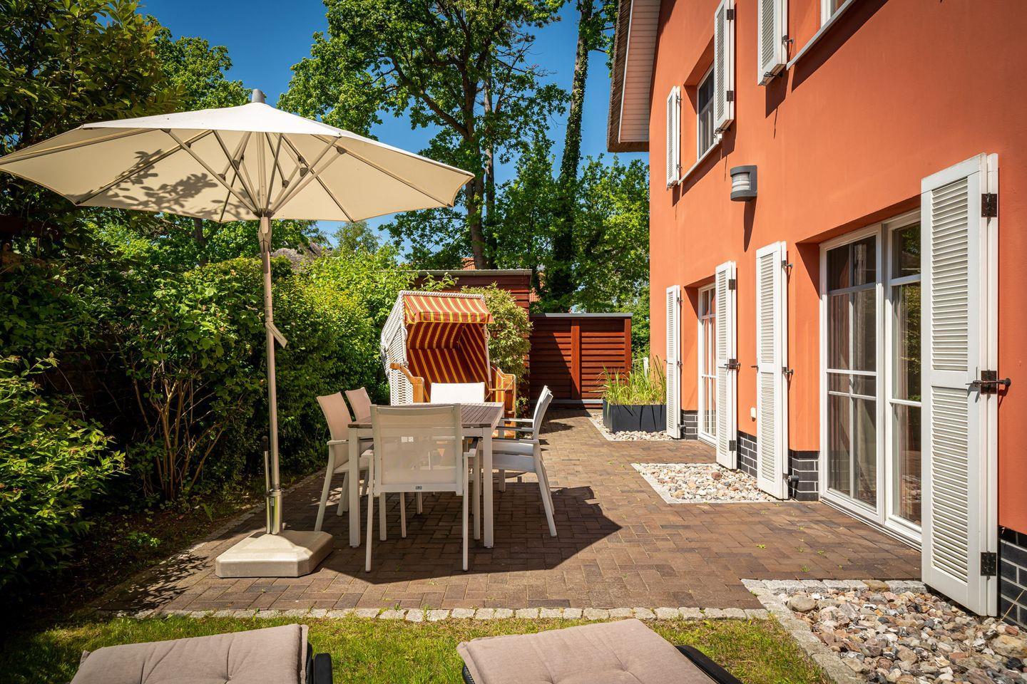 Der Außenbereich verfügt über eine großzügige Terrasse samt Strandkorb. Hier kannst du den Tag bei einem sonnigen Frühstück starten oder mit einem Sommer-Barbecue am Abend ausklingen lassen. Ein Elektrogrill und zwei PKW-Stellplätze stehen dir ebenfalls zur Verfügung.
