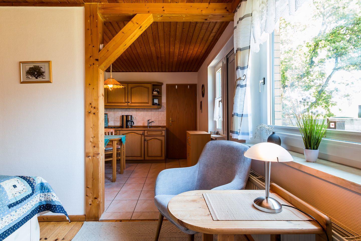 Die kleine und offen gestaltete Dachgeschosswohnung ist über eine Außentreppe erreichbar und bietet dir einen gemütlichen Komfort für zwei Personen. In dem kombinierten Wohn- und Schlafraum erwarten dich ein Doppelbett, ein kleiner Sitzbereich mit TV, ein separater Esstisch und eine Miniküche (Zweiplattenherd). Das Bad mit Dusche/WC schließt sich direkt an. Vom Schlafbereich gelangst du auf die herrliche Dachterrasse mit Blick ins Grüne. Hier kannst du entspannte Urlaubsstunden verbringen und die Seele baumeln lassen.