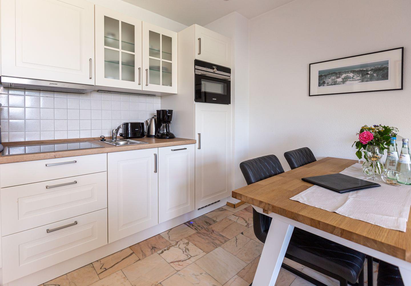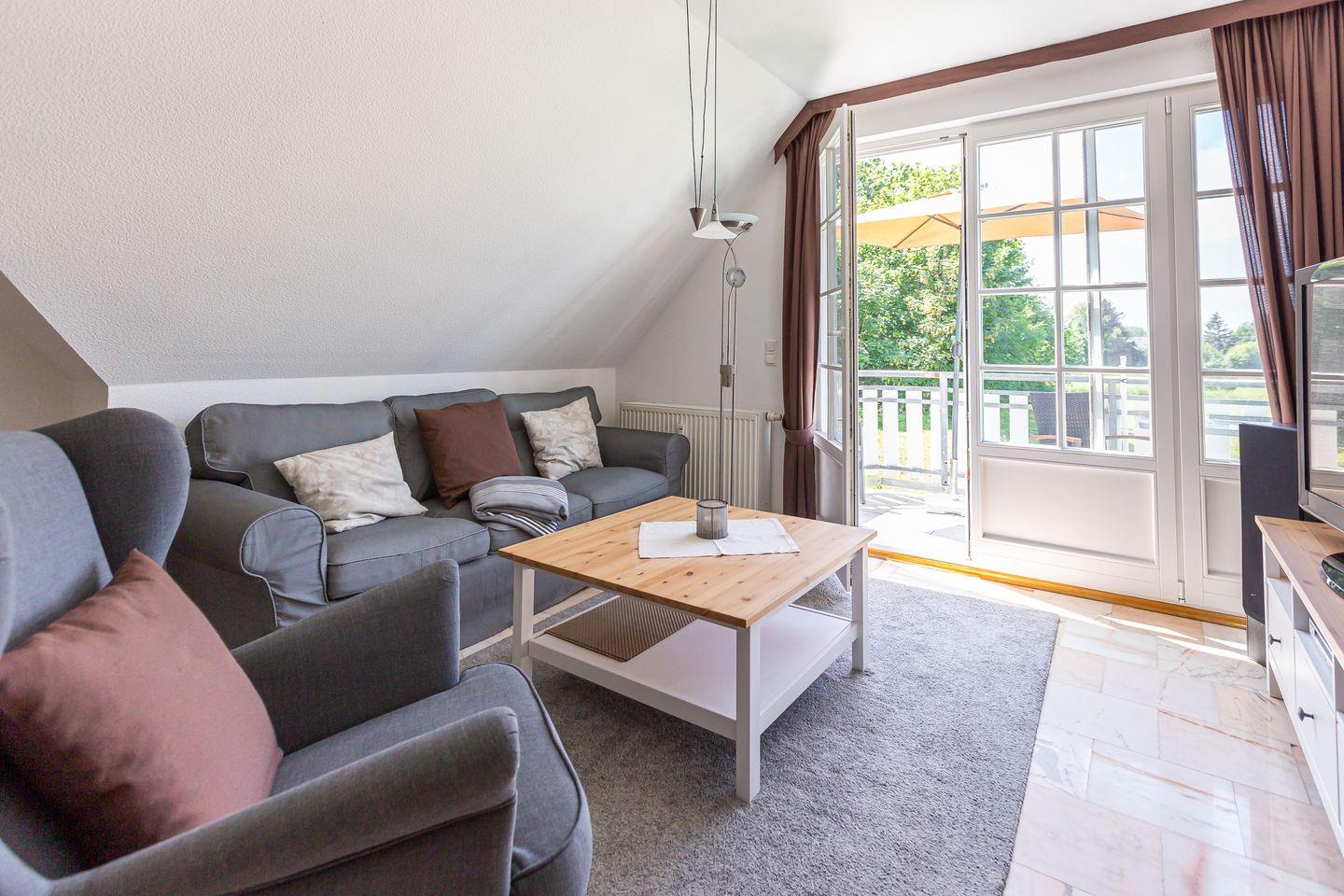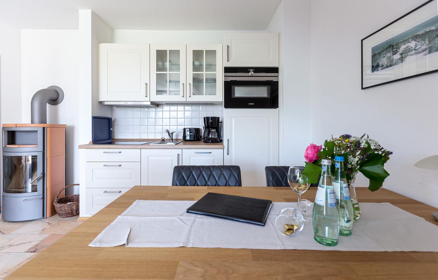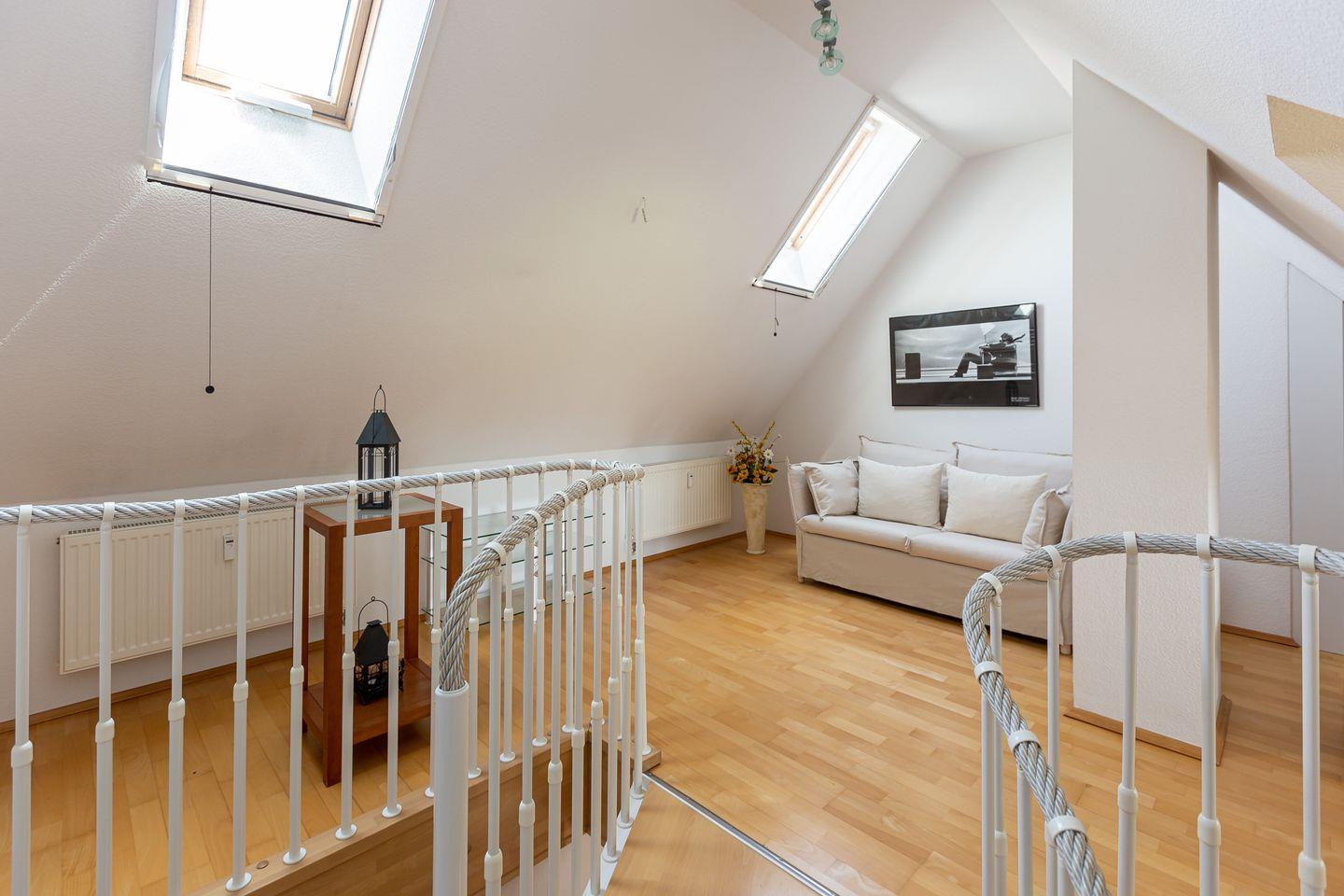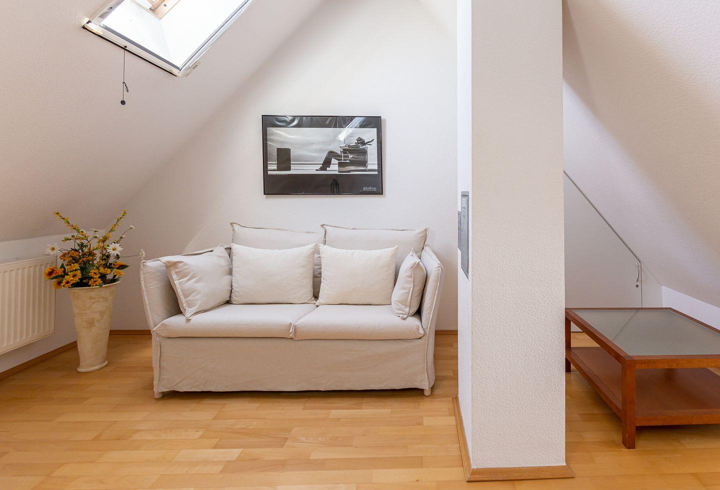 Die Wohnung befindet sich im ersten Obergeschoss eines Mehrfamilienhauses und erstreckt sich über zwei Etagen. Der Wohnraum empfängt dich mit einer gemütlichen Sitzecke am Kaminofen. Die Küchenzeile mit angrenzendem Essbereich ist unmittelbar integriert und schafft einen offenen Wohncharakter. Das Schlafzimmer ist mit einem Doppelbett ausgestattet. Das Bad verfügt über Dusche/WC sowie eine Waschmaschine. Der Balkon ist sowohl vom Wohnbereich, als auch vom Schlafzimmer aus begehbar. Über eine Wendeltreppe gelangst du ins offen gestaltete Dachgeschoss. Von hier genießt du einen freien Blick auf eine wildwachsende Wiese. Auch ein zweiter Schlafbereich mit einem Doppelbett befindet sich hier.