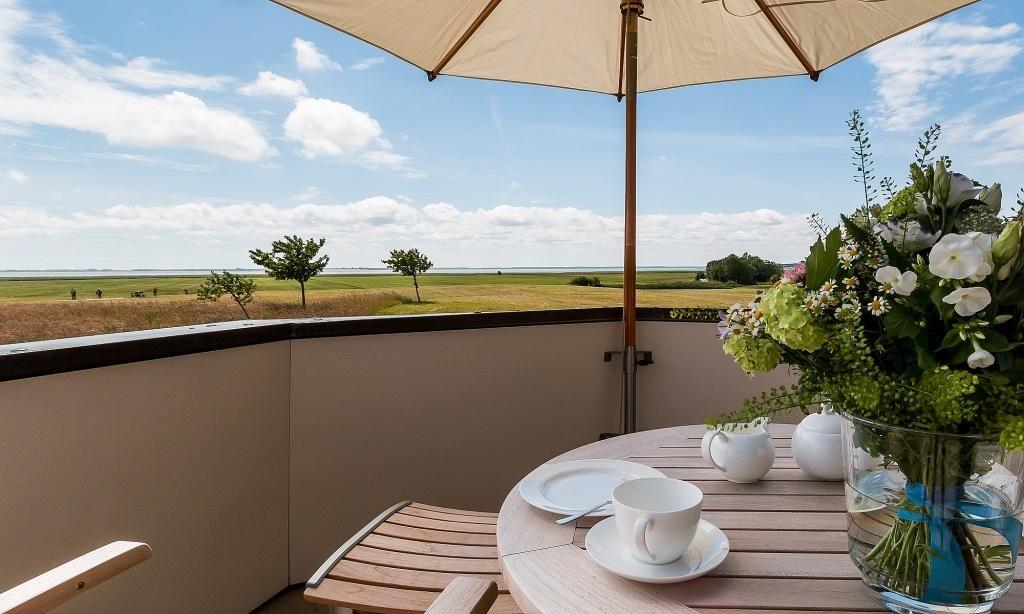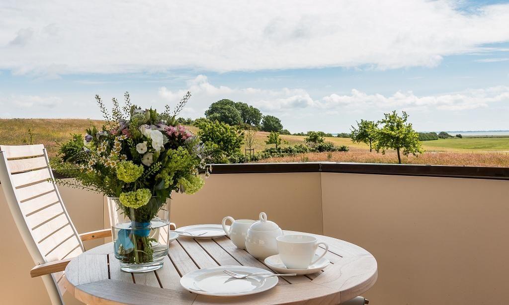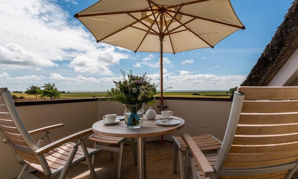 Vom Wohnbereich aus gelangst du direkt auf den Balkon, der dir einen traumhaftem Panoramablick über die weiten Boddenwiesen bis hin zum Bodden bietet. Diese Aussicht gehört zweifelsohne zu den schönsten, die Ahrenshoop zu bieten hat. Zur Ferienwohnung gehört ein PKW-Stellplatz.