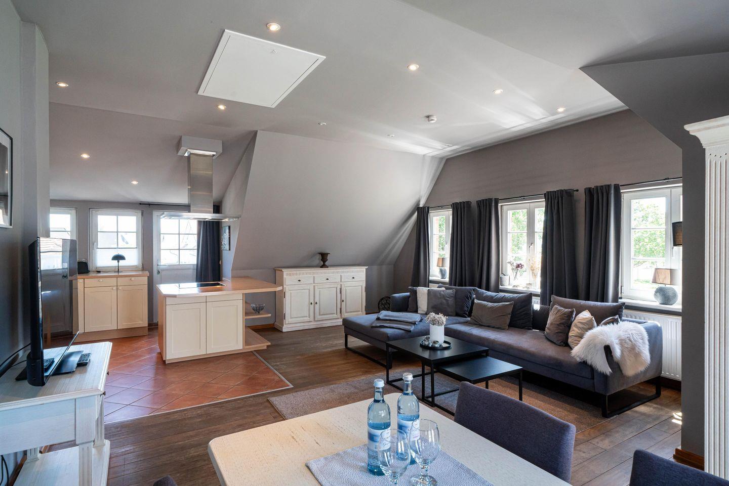 Diese stilvolle Ferienwohnung erstreckt sich über das gesamte Dachgeschoss eines gepflegten Geschäftshauses und bietet viel Raum zum Ankommen, Durchatmen und Wohlfühlen – perfekt für einen erholsamen Urlaub mit bis zu vier Personen. Der Zugang zur Ferienwohnung erfolgt über eine außenliegende Treppe. Die seeseitige Dachterrasse macht Lust auf Meer, Sonne und entspannte Urlaubstage. Im Inneren erwartet dich ein großzügiger, lichtdurchfluteter Wohnbereich mit gemütlicher Sitzecke und einem einladenden Essplatz für gemeinsame Mahlzeiten und lange Abende.
