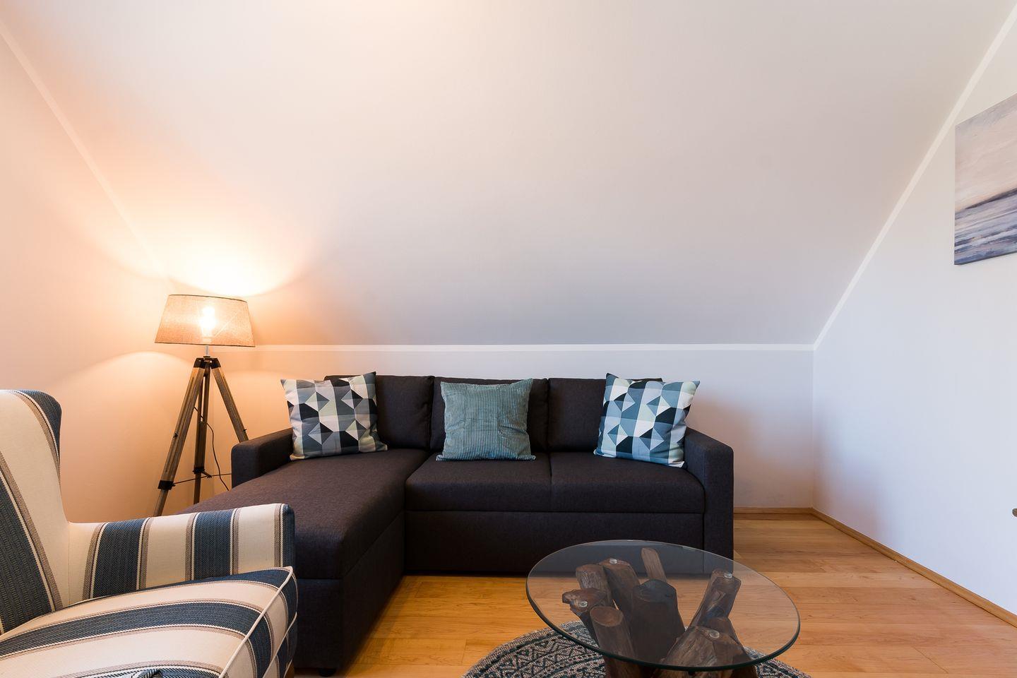 Die gemütliche Obergeschosswohnung verfügt über einen hellen Wohnraum mit integrierter Küchenzeile, ein Schlafzimmer mit Doppelbett sowie ein Bad mit Dusche/WC und Westbalkon. Die Schlafcouch bietet eine zusätzliche Aufbettungsmöglichkeit für zwei Personen. Du liebst es frühstücken zu gehen? Dann brauchst du nur die Treppe runter und ins Café Pieni zu kommen. Das niedliche Café befindet sich im selben Haus.