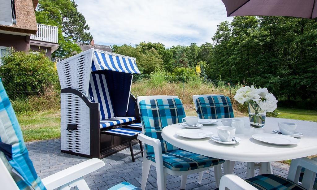 Im Außenbereich erwartet dich eine Steinterrasse mit Gartenmöbeln und Kamingrill. Ein Strandkorb und zwei Sonnenliegen befinden sich ebenfalls am Haus und stehen für erholsame Stunden bereit. So schön kann Urlaub sein. Der große Garten ist für die gemeinschaftliche Nutzung vorgesehen. Dir stehen außerdem ein abschließbarer Fahrradschuppen sowie zwei PKW-Stellplätze zur Verfügung.