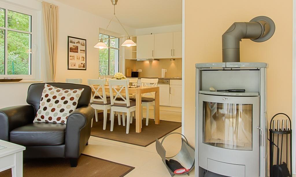 Im Erdgeschoss der Doppelhaushälfte erwartet dich ein sonnendurchfluteter Wohnraum mit einer gemütlichen Sitzecke und TV-Bereich. Der Kaminofen trennt den Wohnbereich von der offenen Küche. Dank der komfortablen Ausstattung und dem großzügigen Esstisch kannst du hier nach Herzenslust Kochen und Klönen. Ein Bad mit Dusche/WC und der Hauswirtschaftsraum befinden sich ebenfalls auf der unteren Etage. Im Dachgeschoss liegen insgesamt drei freundlich gestaltete Schlafzimmer. Zwei Schlafzimmer verfügen jeweils über ein Doppelbett und ein Schlafzimmer über ein ausziehbares Kojenbett. Das Hauptbadezimmer mit Dusche/WC und integrierter Sauna rundet die Ferienhaushälfte wunderbar ab.