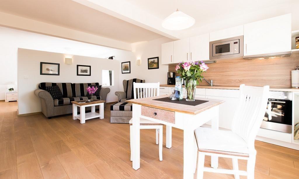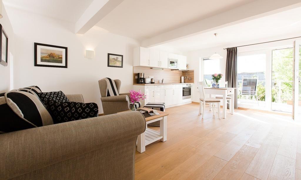Die Dachgeschosswohnung für zwei Personen mit Südausrichtung verfügt über einen großzügigen, kombinierten Wohn- und Schlafbereich mit integrierter Küchenzeile und Essbereich. Der Schlafbereich ist durch eine Trennwand vom Wohnbereich abgetrennt und verfügt über ein Doppelbett und Kleiderschrank. Von der Dachterrasse genießt du einen tollen Ausblick auf die Ostsee. Ein modernes Badezimmer mit Badewanne und Duschvorrichtung sowie dem WC rundet diese moderne Ferienwohnung ab.
