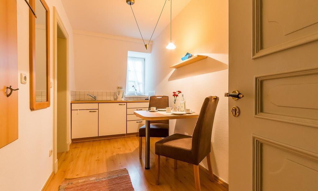 Der helle und freundliche Wohnraum empfängt seine Gäste mit einer gemütlichen Sitzecke und TV Bereich. Auch die kleien Küche mit Essplatz ist gut ausgestattet und bietet alles, was es zum Kochen im Urlaub braucht. Eine Tür weiter geht es ins Schlafzimmer, das mit zwei Einzelbetten (nicht zusammenstellbar) ausgestattet ist. Das Tageslicht-Bad verfügt über Dusche/WC.