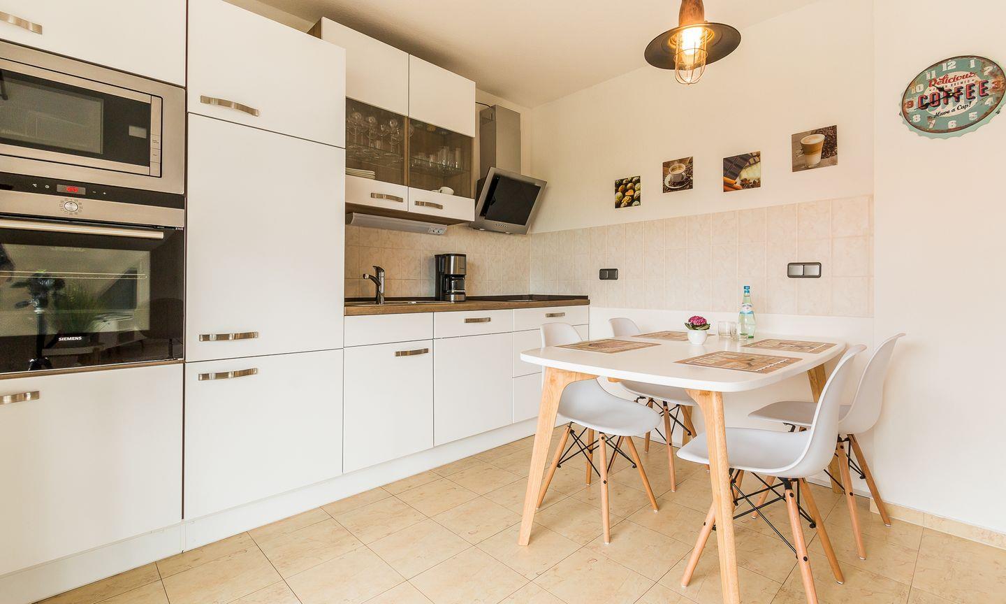 Im Obergeschoss erwartet dich ein großzügiger Wohnraum mit einer komfortablen Sitzecke. Die Einbauküche ist komplett ausgestattet, sogar eine Tassimo-Kaffeemaschine steht bereit. Küche und Essbereich schließen sich dem Wohnbereich an. Genieße die Sonnenuntergänge über der Ostsee auf einem der Balkone bei einem guten Glas Wein. Du kannst wählen, ob du den Balkon in Nord-West-Ausrichtung (vom Küchenbereich begehbar) nutzen möchtest oder auf dem Balkon in Süd-West-Lage einen geselligen Grillabend (nur mit dem vorhandenen Elektrogrill) genießt. Die zwei Schlafzimmer sind jeweils mit einem Boxspringbett und einem TV ausgestattet. Hier kannst den Tag Revue passieren lassen und dich traumhaft betten. Das Tageslichtbad wurde neu modernisiert und ist mit einer Badewanne, Dusche/WC und einem Handtuchtrockner ausgestattet.