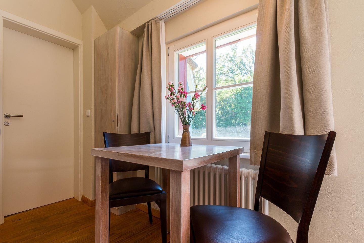 Man könnte auch Tiny House dazu sagen. Beim Lütthus bekommst du alles, was du zum Urlauben auf kleinstem Raum brauchst. Der heimelige kombinierte Wohn-und Schlafraum beherbergt ein Doppelbett, eine Küchenzeile, einen Esstisch mit zwei Stühlen und ein Bad mit Dusche/WC.