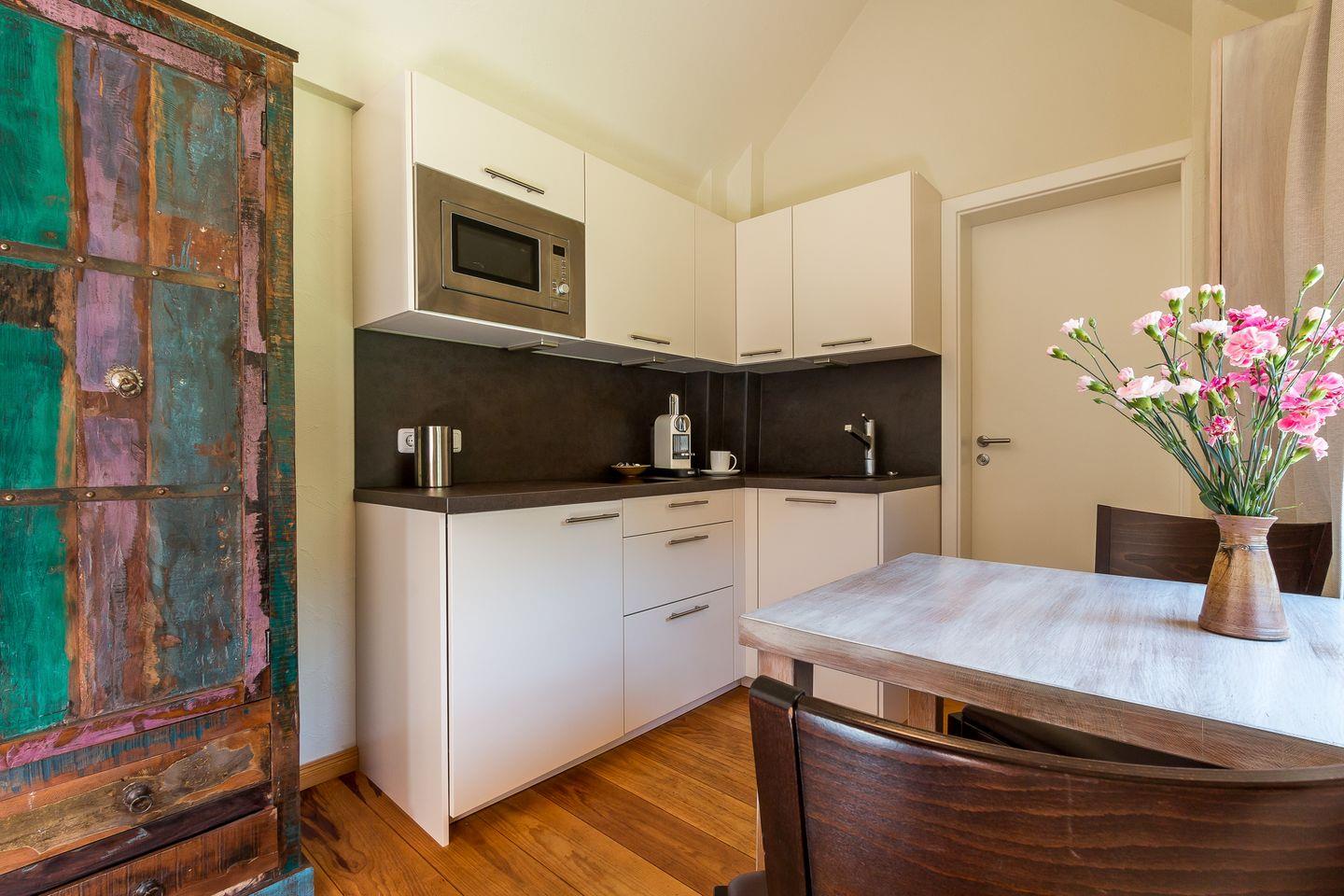 Beachte bitte, dass keine Filterkaffeemaschine und kein Wasserkocher vorhanden sind.