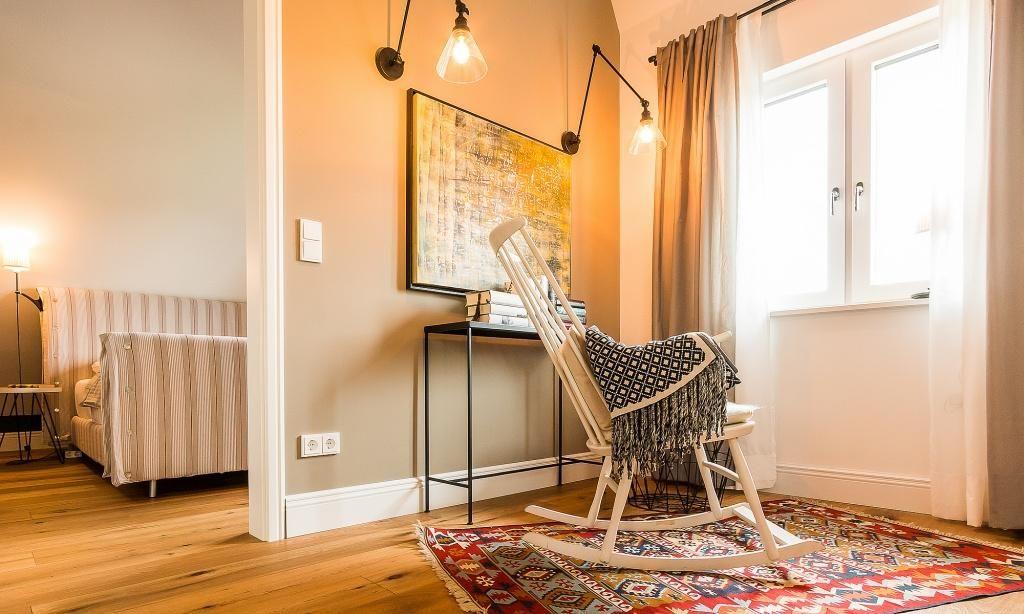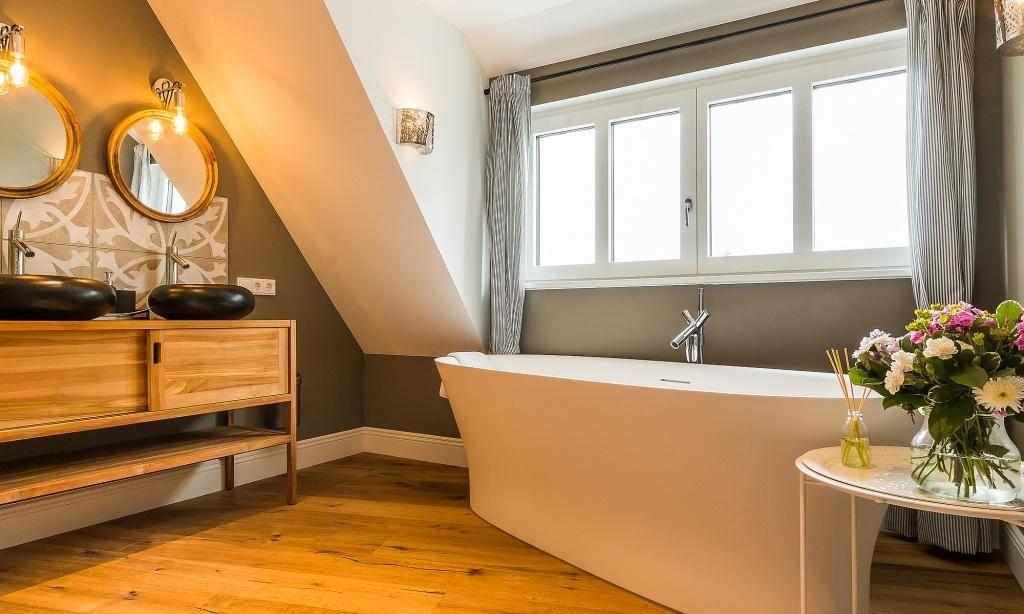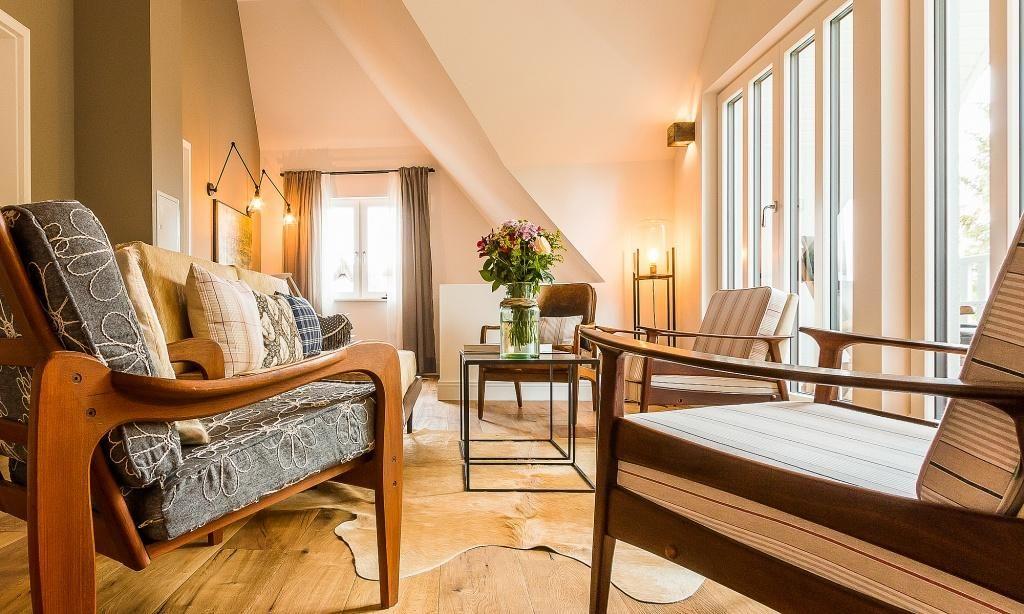 Im fischlandtypischen Stil erbaut, versprüht schon die Außenansicht des Hyggelig Hus Urlaubsfeeling pur. Auch der Innebereich begeistert mit dem geschmackvollen und individuellen Stilmix aus dänischen Vintage-Unikaten, Industrial- und Landhausdesign. Im Erdgeschoss erwartet dich neben der Diele der großzügige und liebevoll eingerichtete Wohnbereich mit einem Kamin. Der Eichenboden verleiht dem Raum zusätzlich Gemütlichkeit. Die offene Premium-Echtholz-Einbauküche mit Kochinsel und hochwertiger Küchenausstattung (Miele, Braun und Villeroy & Boch) lässt garantiert das Herz jedes Kochbegeisterten höher schlagen. Der Essbereich schließt sich der hochwertigen Küche an. Ein Schlafzimmer, ausgestattet mit einem Doppelbett, ein separates WC sowie ein Hauswirtschaftsraum befinden sich ebenfalls im Erdgeschoss. Eine entspannte Auszeit findest du auch im hauseigenen Spa mit Sauna und Rainshower-Dusche. Die Gartendusche, die über den direkten Zugang von der Sauna aus erreichbar ist, sorgt für den Extra-Kick. Im Obergeschoss erwartet dich eine großzügige Lese-Galerie mit Austritt auf den herrlichen Balkon. Ein Schlafzimmer mit Doppelbett, ein Kinderzimmer mit zwei Einzelbetten, ein traumhaftes Bad mit freistehender Badewanne und Rainshower-Dusche sowie ein separates WC befinden sich ebenfalls auf der oberen Etage. Handgefertigte Dekoelemente und ausgewählte Designermöbel im gesamten Haus machen dieses wunderschöne Ferienobjekt zu einem ganz besonderen Quartier für Design-Fans und Individualisten.