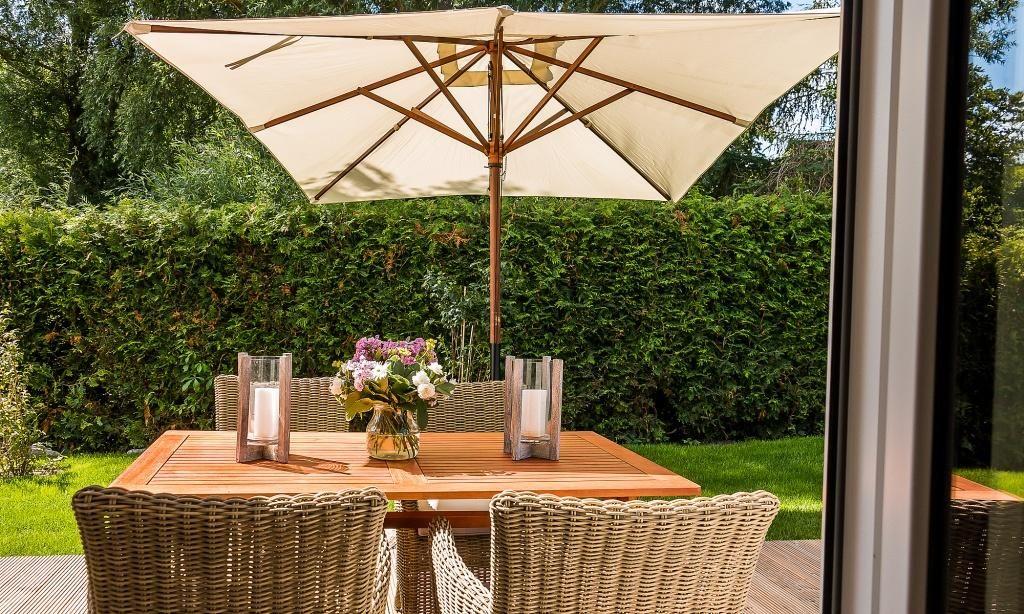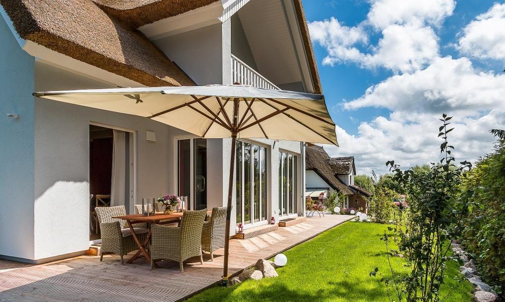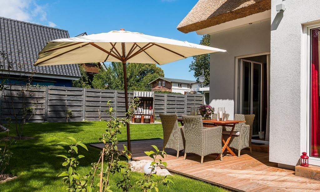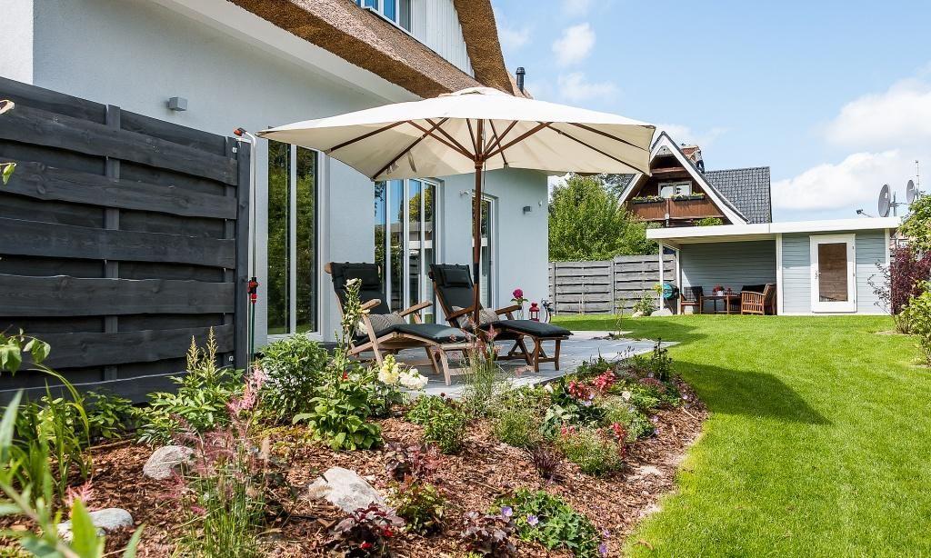 Der Außenbereich begeistert mit einem 750 Quadratmeter großen Grundstück, dass liebevoll angelegt wurde. Neben der überdachten Sitzecke im Garten erwartet dich auch ein Strandkorb am Haus und vier Sonnenliegen. Die Terrasse in Südlage, der Grillplatz mit Gasgrill und weitere Sitzmöglichkeiten runden das Wohlfühl-Ensemble perfekt ab. Zum Ferienhaus gehören zwei PKW-Stellplätze sowie eine hauseigene Ladestation für E-Autos.