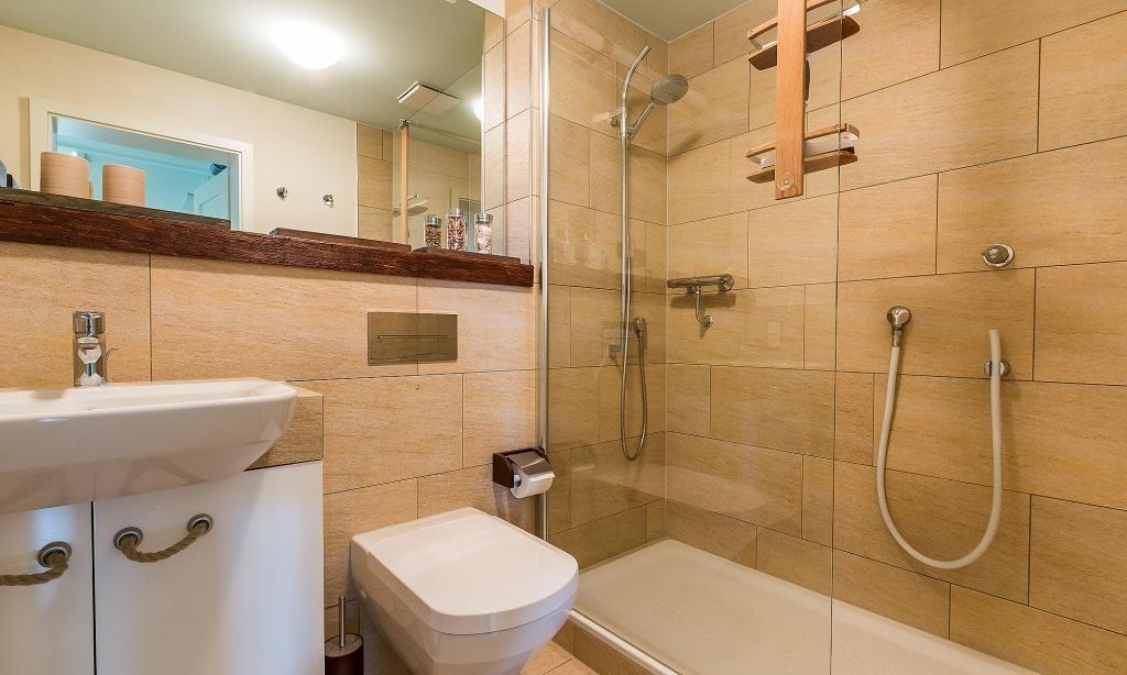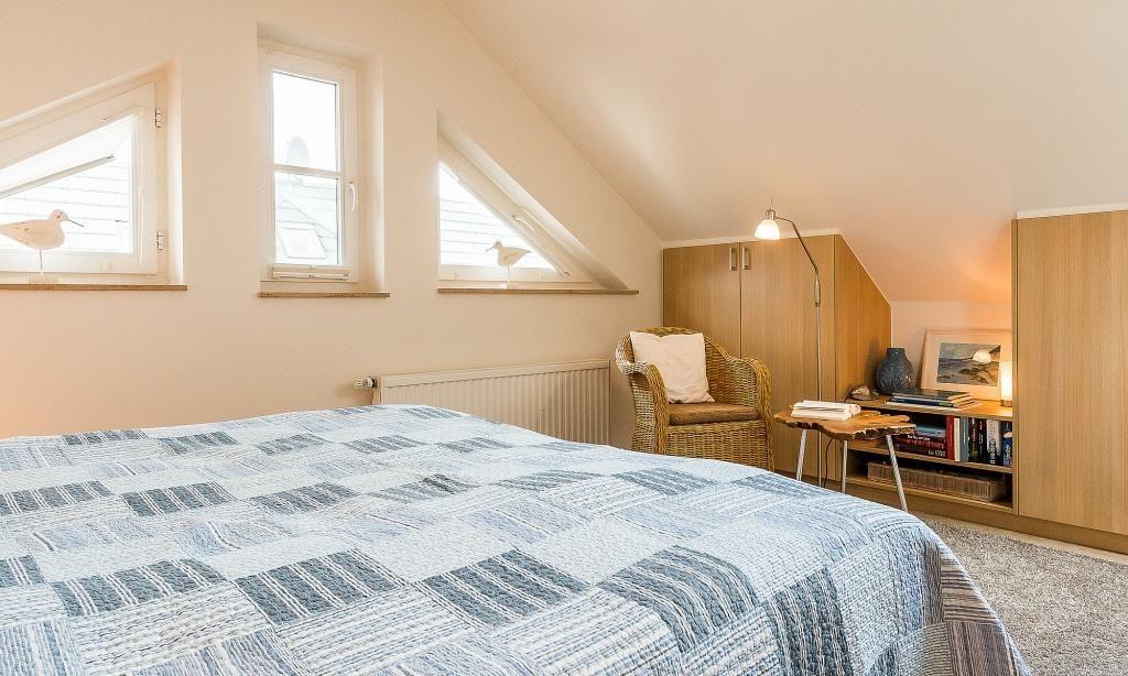 Im Obergeschoss erwartet dich der gemütliche Wohnbereich mit Essbereich. Die offene Küche ist funktional ausgestattet, hier findet sich alles, was man zum Kochen benötigt. Ein Schlafzimmer mit einem Doppelbett und ein ansprechendes Bad mit Dusche / WC und einem Kneippschlauch befinden sich ebenfalls auf der ersten Etage. Vom Wohnbereich gelangst du über eine Treppe ins Dachgeschoss. Offen gestaltet, befindet sich hier das zweite großzügige Schlafzimmer, ebenfalls mit einem Doppelbett und vielen Einbauschränken ausgestattet. Für noch mehr Wohnkomfort wurden Insektengaze angebracht.