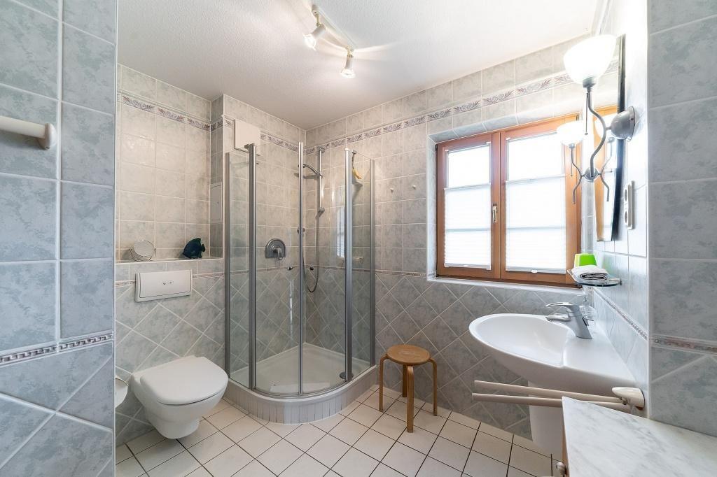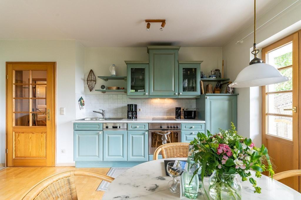 In der Erdgeschoss-Wohnung erwartet dich der offene Wohn- und Küchenbereich mit gemütlicher Sitzecke am Kamin und angrenzenden Essbereich, ein Schlafzimmer mit einem Doppelbett sowie ein Bad mit Dusche/WC und Handtuchtrockner. Die Küche im Landhaus-Stil ist mit allem ausgestattet, was es zum Kochen braucht. Vom Wohnbereich und Schlafzimmer aus gelangst du auf die Terrasse. Zusätzlich steht dir im Hauswirtschaftsraum ein Waschtrockner zur Verfügung.