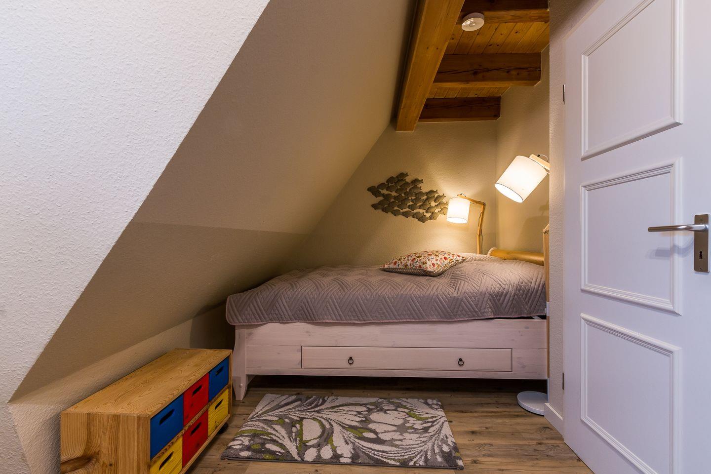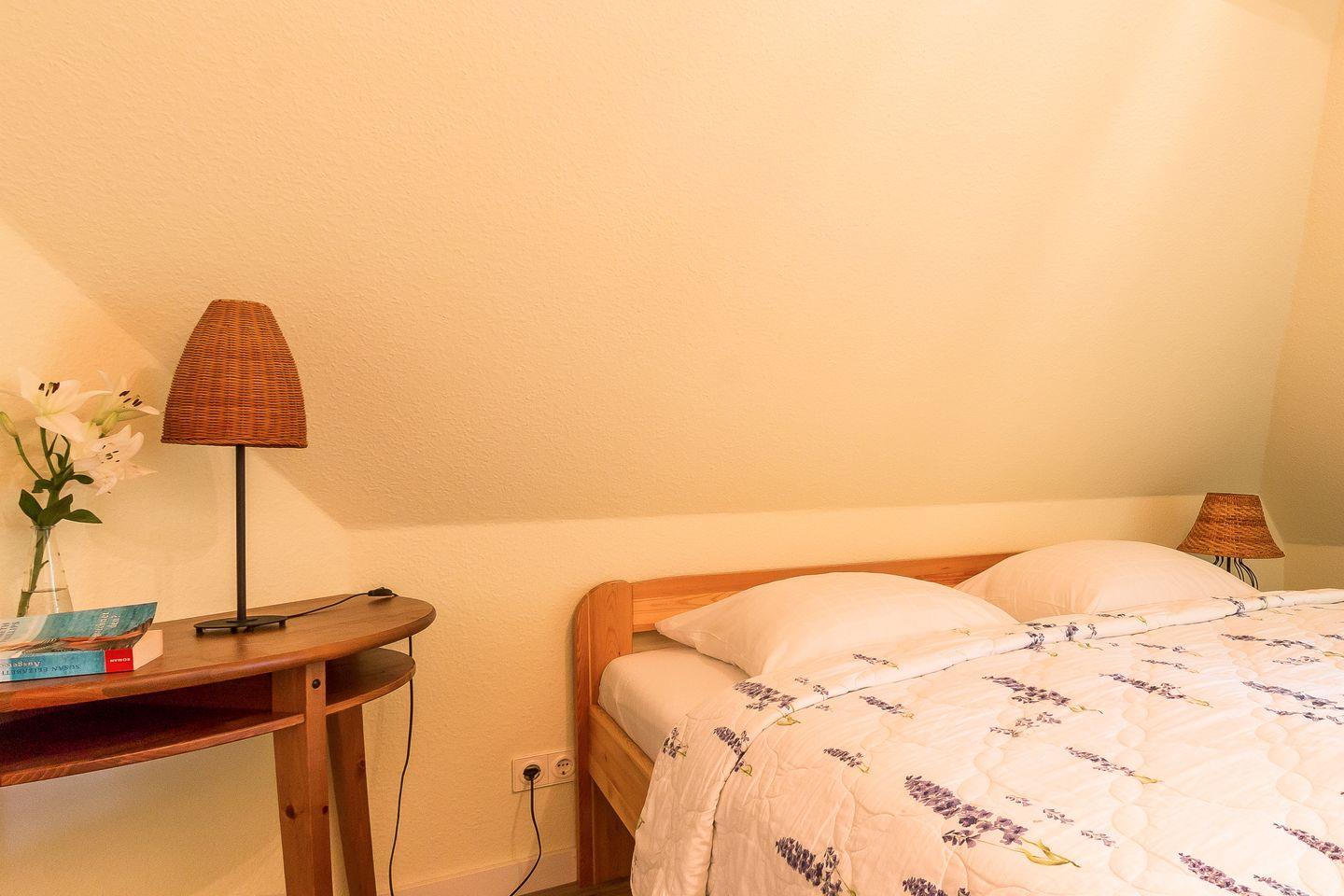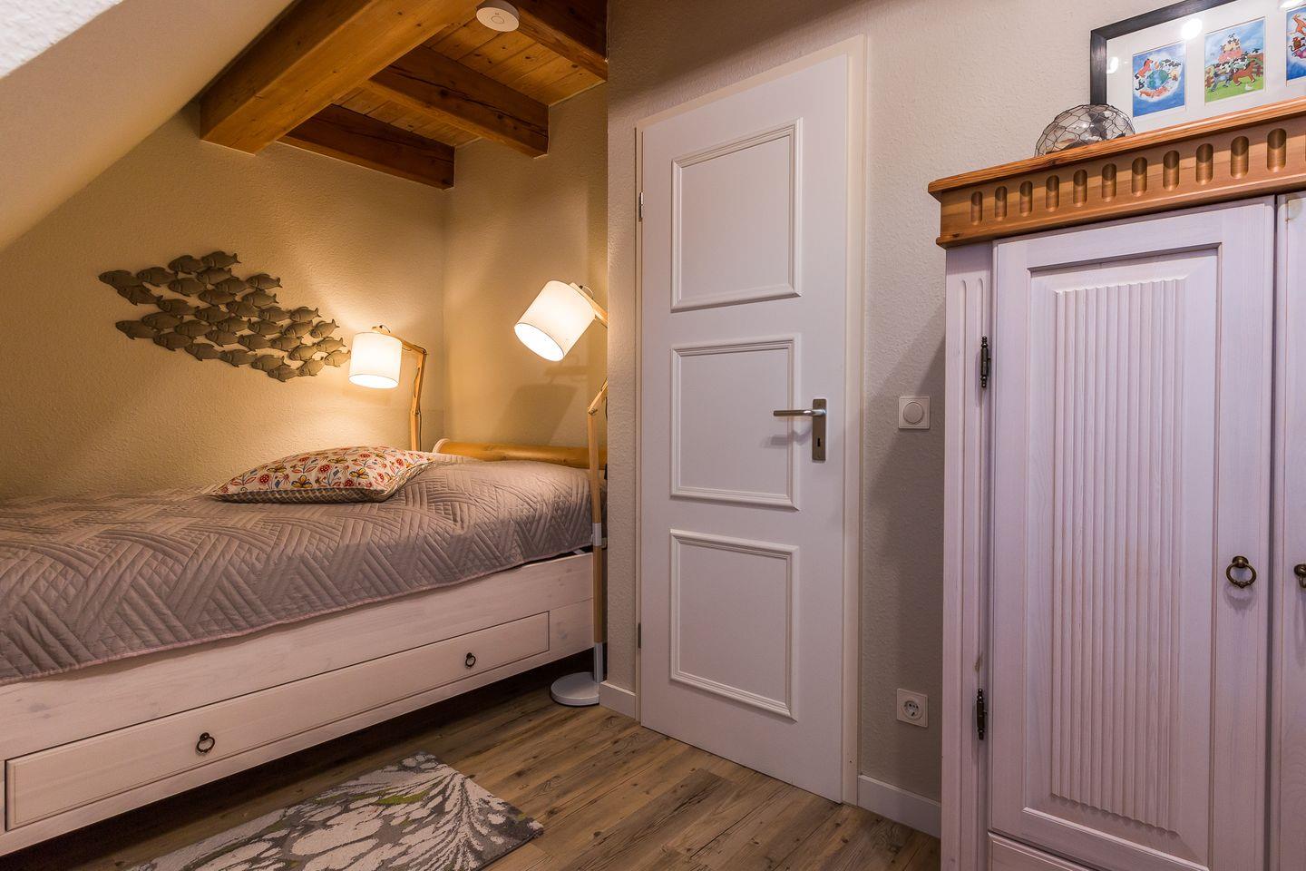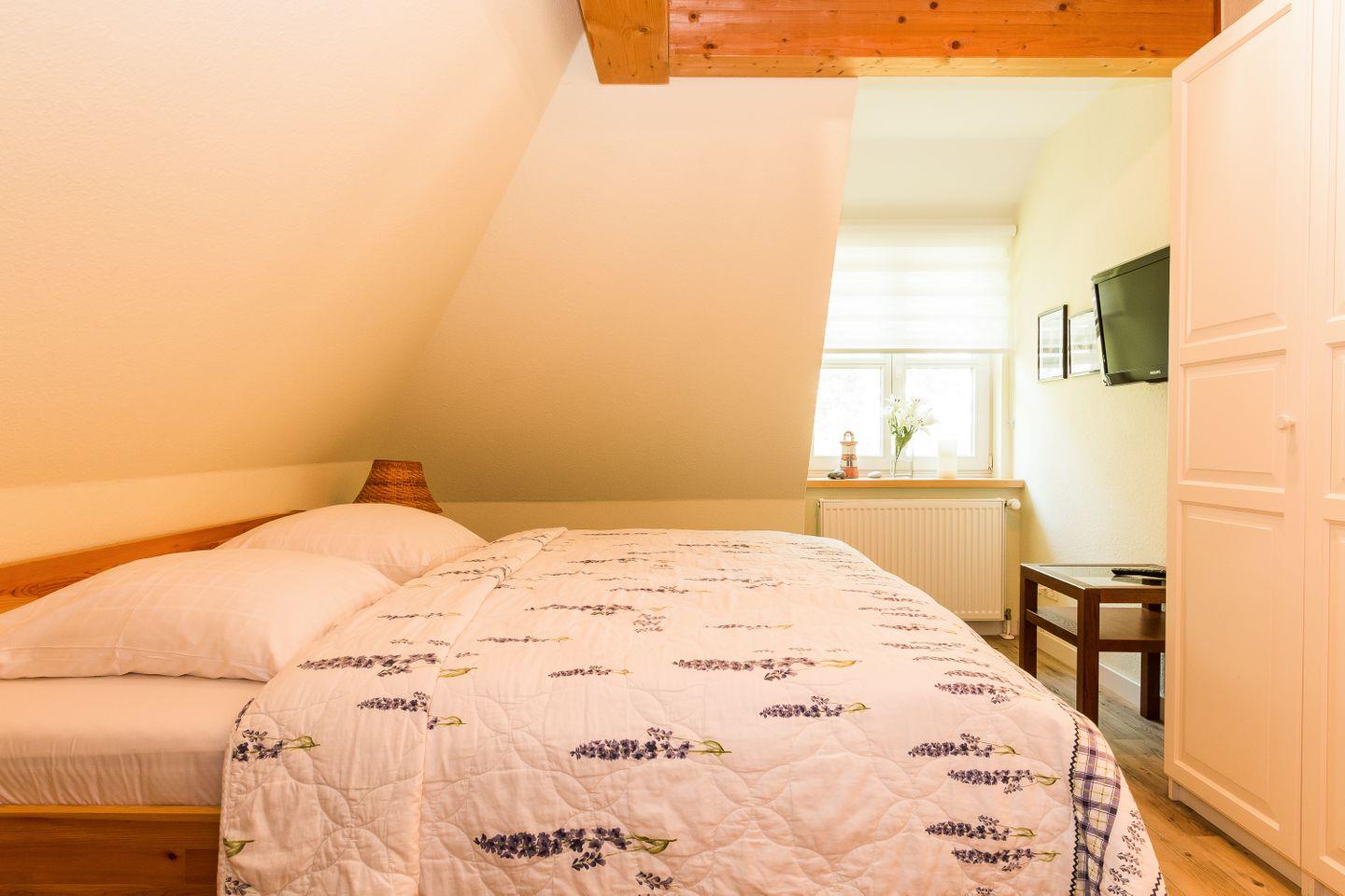 Im ersten Obergeschoss befindet sich ein liebevoll eingerichtete Maisonette-Ferienwohnung. Der Wohnraum mit einer gemütlichen Sitzecke sowie eine Wohnküche mit großem Esstisch ist Mittelpunkt der Unterkunft. Weiterhin findet ein Bad mit Dusche/WC in dieser Etage Platz. Das zweite Obergeschoss verfügt über ein Schlafzimmer mit einem Doppelbett sowie ein Schlafzimmer mit einem französischen Doppelbett. Weiterhin gibt es ein zweites Bad mit Wanne/WC und Waschmaschine. Das Dachgeschoss (über eine steile Treppe zu erreichen) ist zu einer offenen Galerie ausgebaut und bietet zwei zusätzliche Schlafmöglichkeiten.