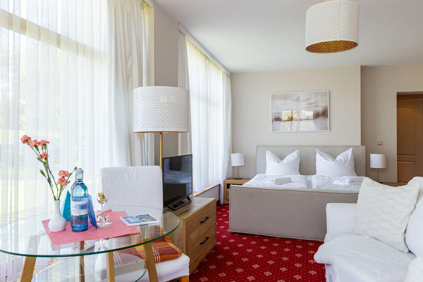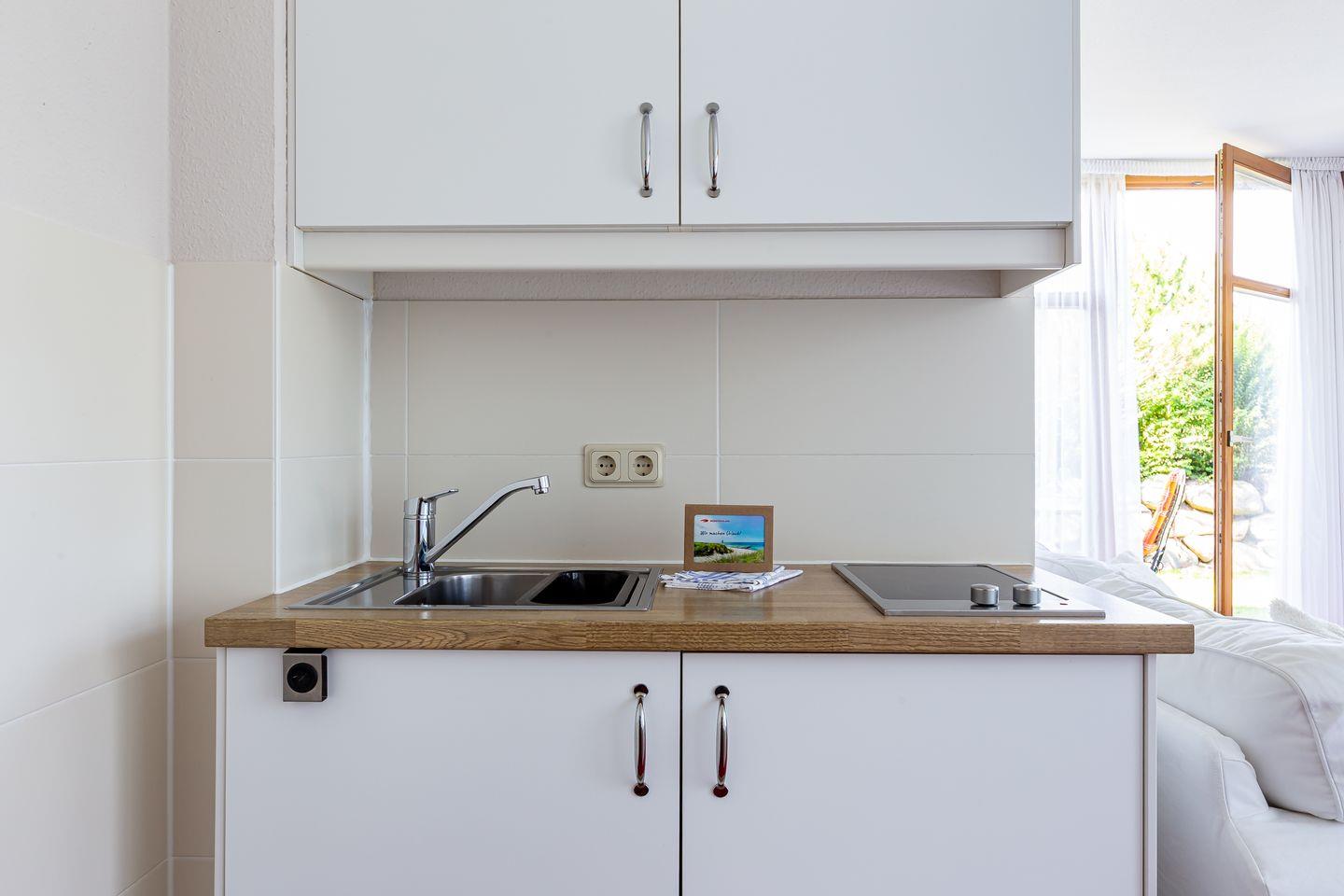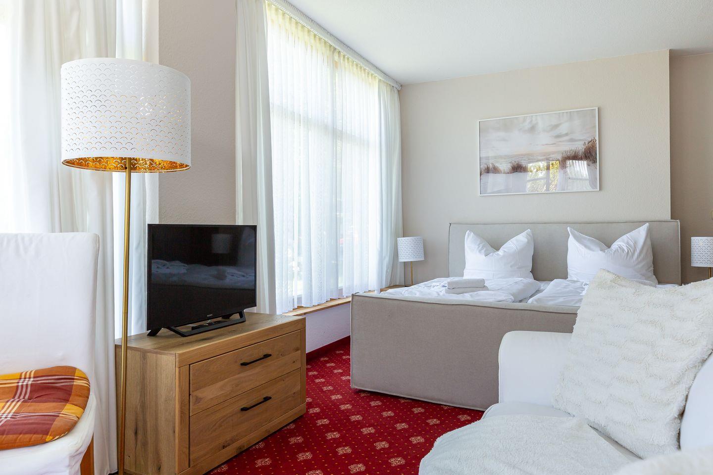 Das kleine Einraum-Appartement ist passend zum Strand mit Holz und hellen Farben eingerichtet. Im Wohn- und Schlafraum befinden sich eine kleine Sitzgelegenheit, ein Doppelbett, eine Miniküche und ein Esstisch an bodentiefen Fenstern. Das separate Bad mit Dusche/ WC schließt sich dem Wohnraum an.