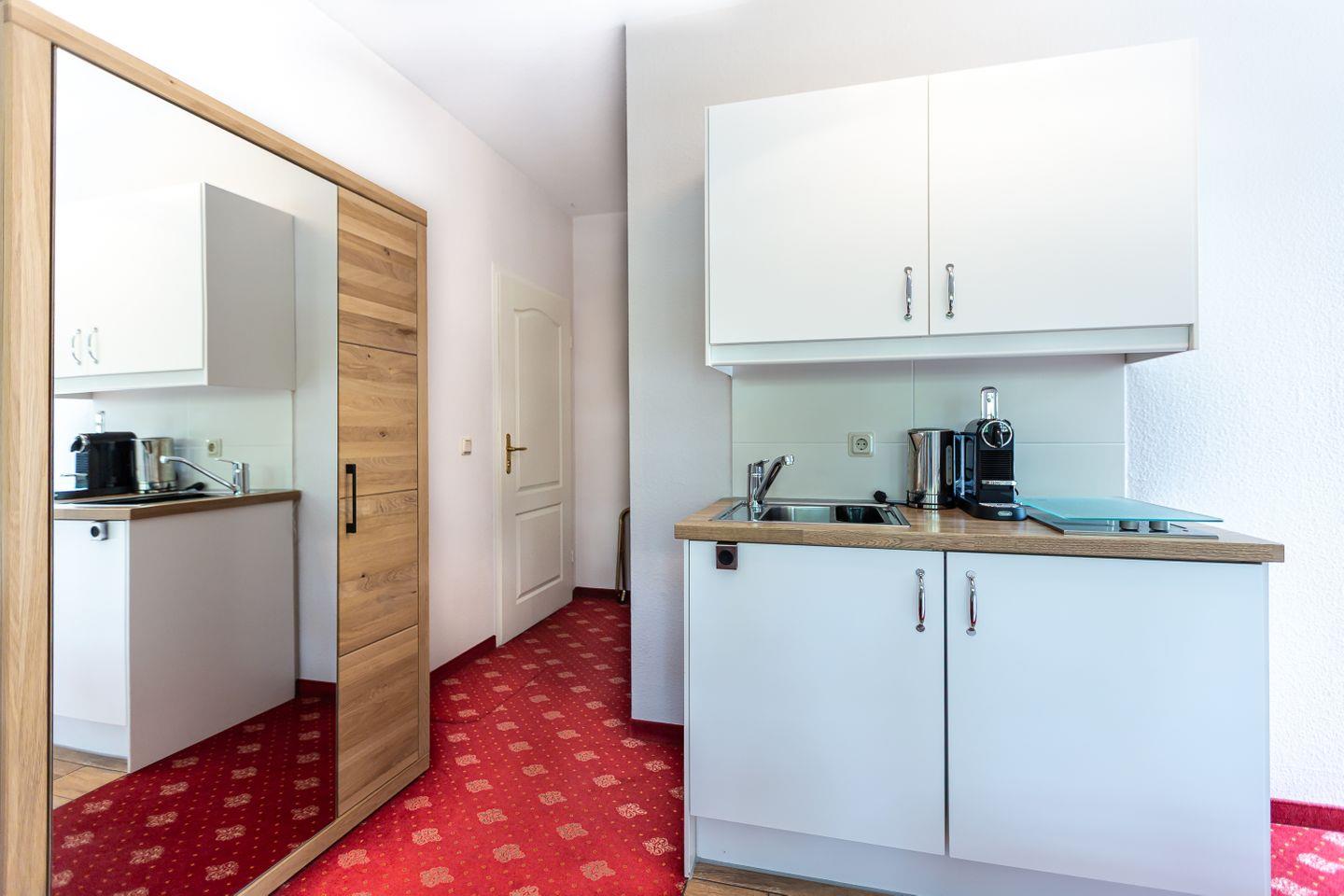 Das gemütliche Einraum-Appartement im ersten Stock ist passend zum Strand mit Holz und hellen Farben eingerichtet. Im Wohn- und Schlafraum befinden sich eine kleine Sitzgelegenheit, ein Doppelbett (140 cm), eine Miniküche und ein Esstisch an bodentiefen Fenstern. Das separate Bad ist mit Dusche/WC ausgestattet.
