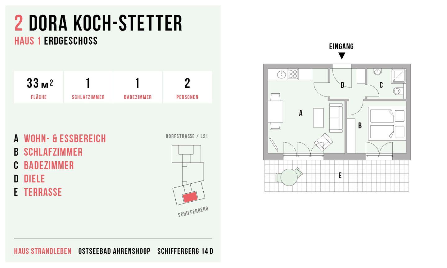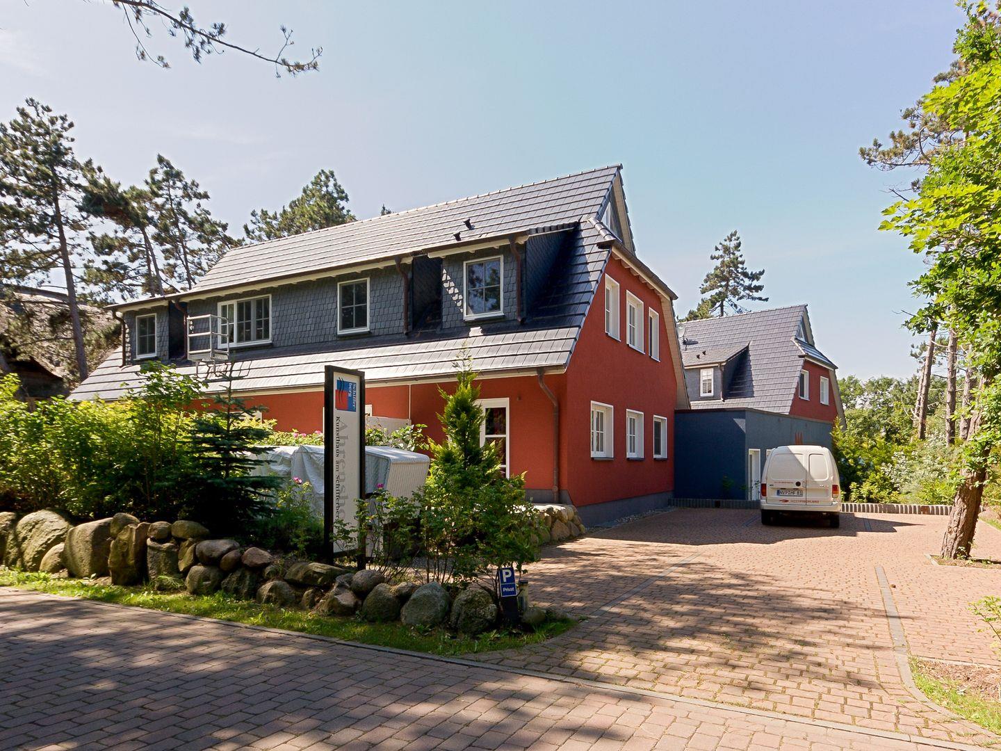 Die Hausanlage mit 13 Ferienwohnungen liegt nur 150 Meter vom weißen Ostseestrand entfernt und befindet sich direkt an der Bäderstraße L21. Neben der strandnahen Lage ist auch der Ortskern mit Bäckereien und einer Vielzahl von Restaurants, Cafés und Kunstgalerien nur ca. einen Kilometer entfernt. Der angrenzende Deich eignet sich perfekt für Wanderungen oder Radtouren in den Nationalpark, zum Weststrand und entlang der weiten Boddenlandschaft.
