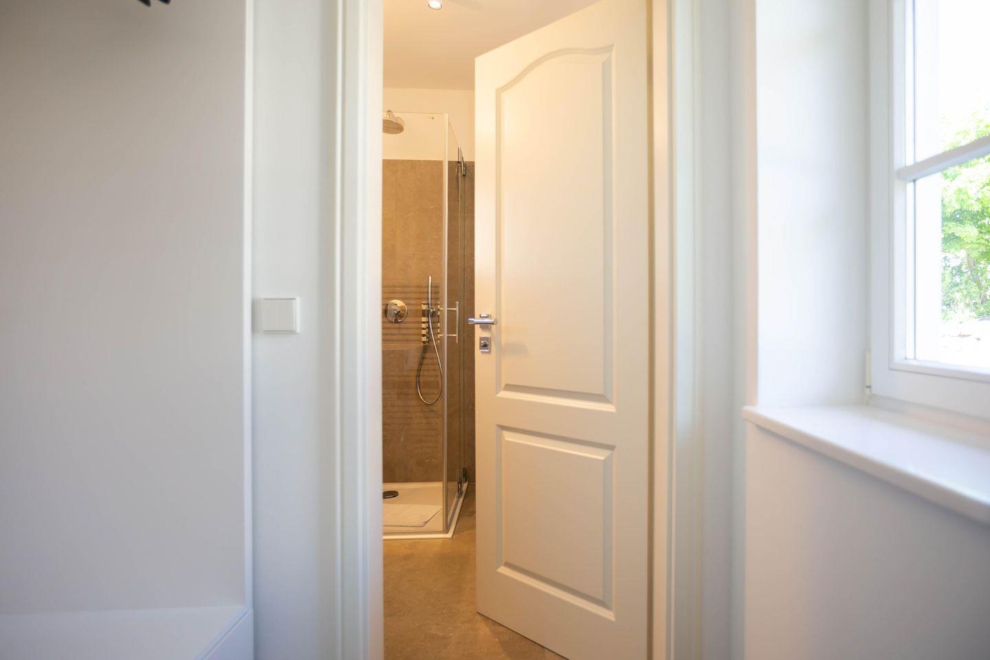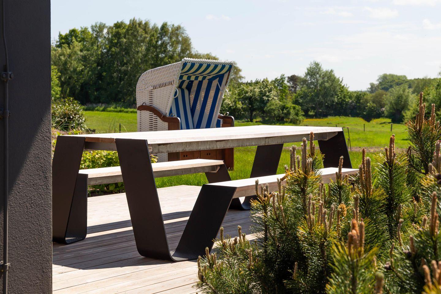 Auf der großzügigen Terrasse im Außenbereich genießt du einen unverbauten Blick über weite Wiesen bis zum Bodden. Dabei sorgt die aufwendig gestaltete Gartenarchitektur für ausreichend Privatsphäre, so dass du dich auch unter freiem Himmel entspannen kannst. Dir stehen zudem zwei PKW-Stellplätze und ein gemeinschaftlich genutzter Grillplatz im hinteren Bereich des weitläufigen Gartens zur Verfügung.