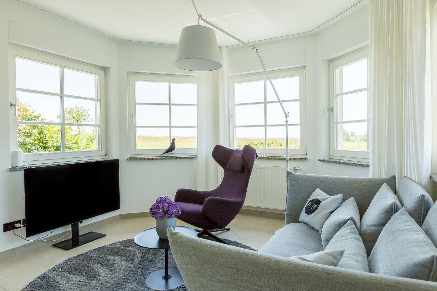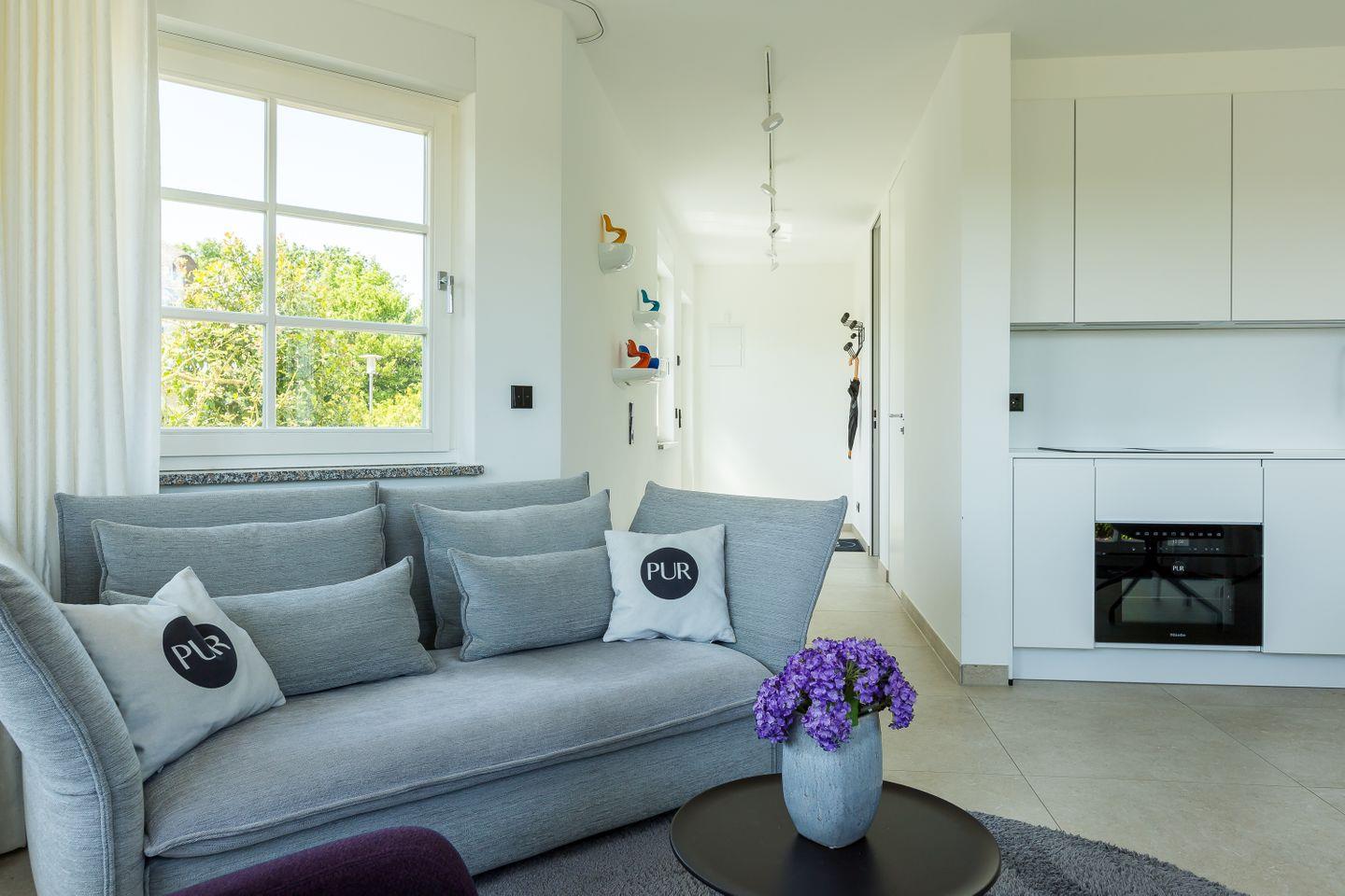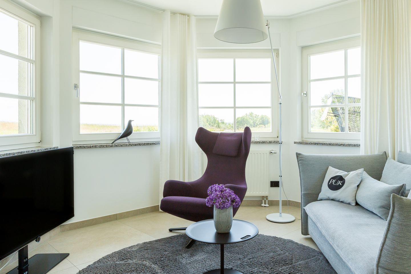 Der mit seinen vielen Fenstern gesäumte und offen gestaltete Erker ist Mittelpunkt der Wohnung. Hier befindet sich der Loungebereich mit hochwertigem Designersofa und -sessel auf der einen Seite sowie die vollausgestattete Küche mit Esstisch auf der anderen. Die dunklen Farbakzente im Schlafzimmer sorgen zusammen mit dem hochwertigen Boxspringbett für einen traumhaften Rückzugsort und erholsamen Schlaf. Abgerundet wird die Ferienwohnung durch das moderne Badezimmer mit bodengleicher Regendusche, Handtuchtrockner und WC. PUR A2 schafft, wie alle anderen PUR-Ferienobjekte - durch die reduzierte Ästhetik einen ganz besonderen Wohncharakter und zeigt die Liebe der Eigentümer zu Design und Interieur.