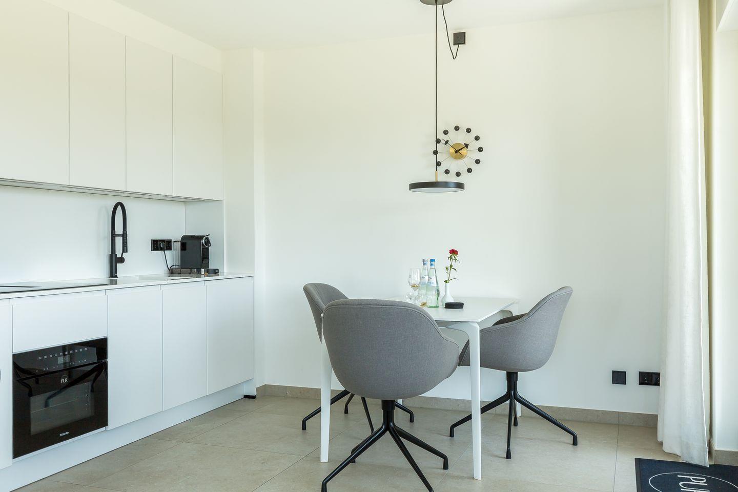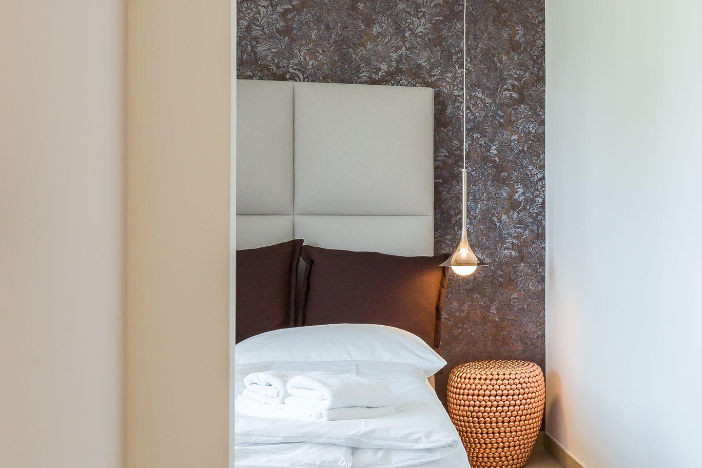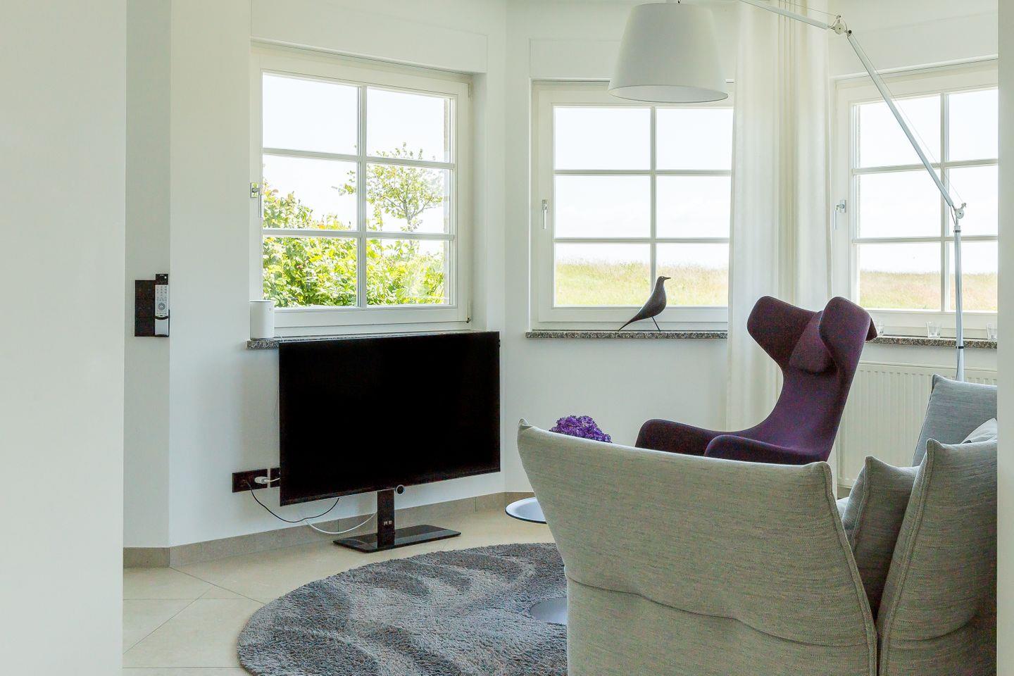 Der mit seinen vielen Fenstern gesäumte und offen gestaltete Erker ist Mittelpunkt der Wohnung. Hier befindet sich der Loungebereich mit hochwertigem Designersofa und -sessel auf der einen Seite sowie die vollausgestattete Küche mit Esstisch auf der anderen. Die dunklen Farbakzente im Schlafzimmer sorgen zusammen mit dem hochwertigen Boxspringbett für einen traumhaften Rückzugsort und erholsamen Schlaf. Abgerundet wird die Ferienwohnung durch das moderne Badezimmer mit bodengleicher Regendusche, Handtuchtrockner und WC. PUR A2 schafft, wie alle anderen PUR-Ferienobjekte - durch die reduzierte Ästhetik einen ganz besonderen Wohncharakter und zeigt die Liebe der Eigentümer zu Design und Interieur.
