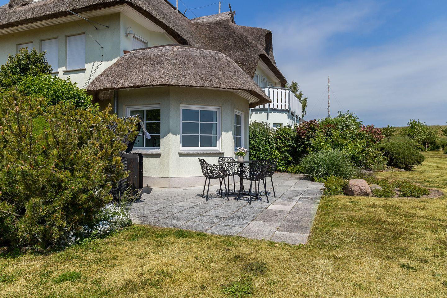Der Außenbereich begeistert mit einer großzügigen Steinterrasse, die du vom Wohnraum aus betrittst. Von hier genießt du einen traumhaften Weitblick über die Wiesenlandschaft und den Saaler Bodden bis zum Horizont. Es ist eben einfach PUR! Zur Ferienwohnung gehört ein PKW-Stellplatz.