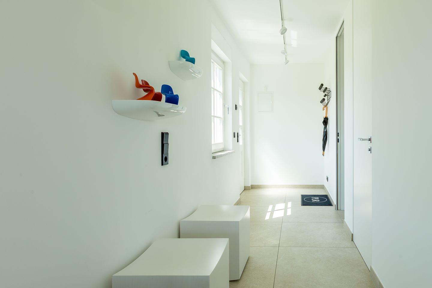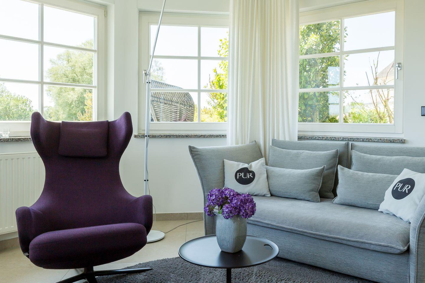 In Gegensatz zum traditionellen Reetdachhaus, steht das sehr moderne Interieur von PUR A2. Designermöbel, spannende Farbkontraste, klare Linien, Kunstobjekte und der minimalistische Einrichtungsstil sind typisch für das PUR-Wohnkonzept und schaffen einen gelungenen Mix aus Gemütlichkeit und Modernität.
