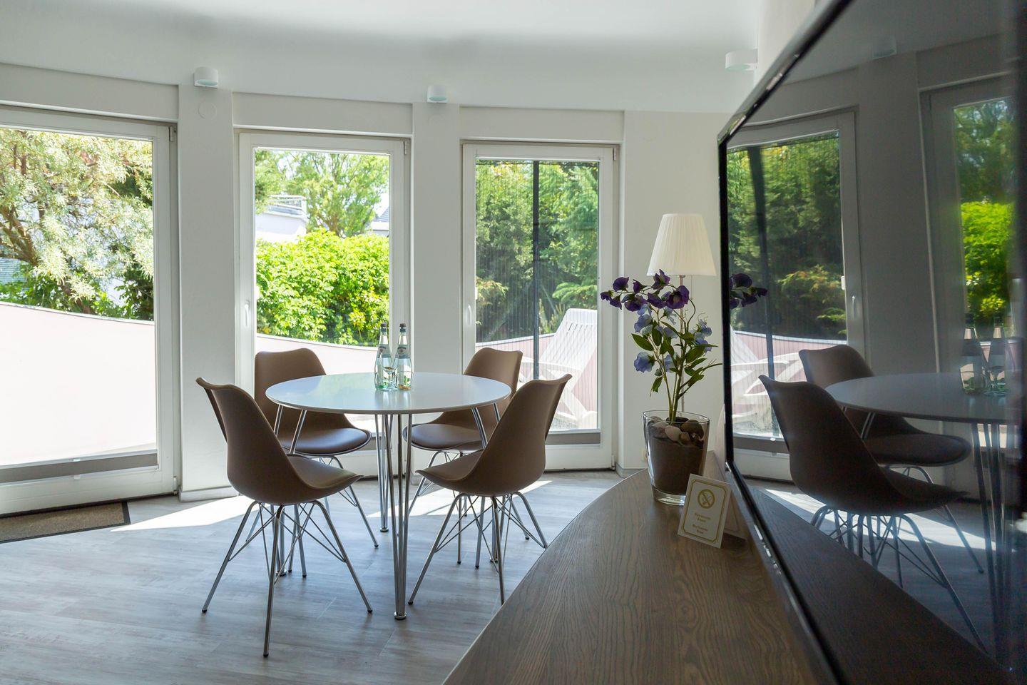 Im Außenbereich steht dir eine kleine sonnige Terrasse mit Tisch und Stühlen zur Verfügung, die von beiden Räumen aus betreten werden kann. Dank der heimischen Pflanzen, die die Terrasse umgeben, kannst du hier ungestört sein, dein Essen unter freiem Himmel genießen oder den Urlaubstag bei einem lauschigen Sommerabend ausklingen lassen. Zur Ferienwohnung gehört außerdem ein PKW-Stellplatz.