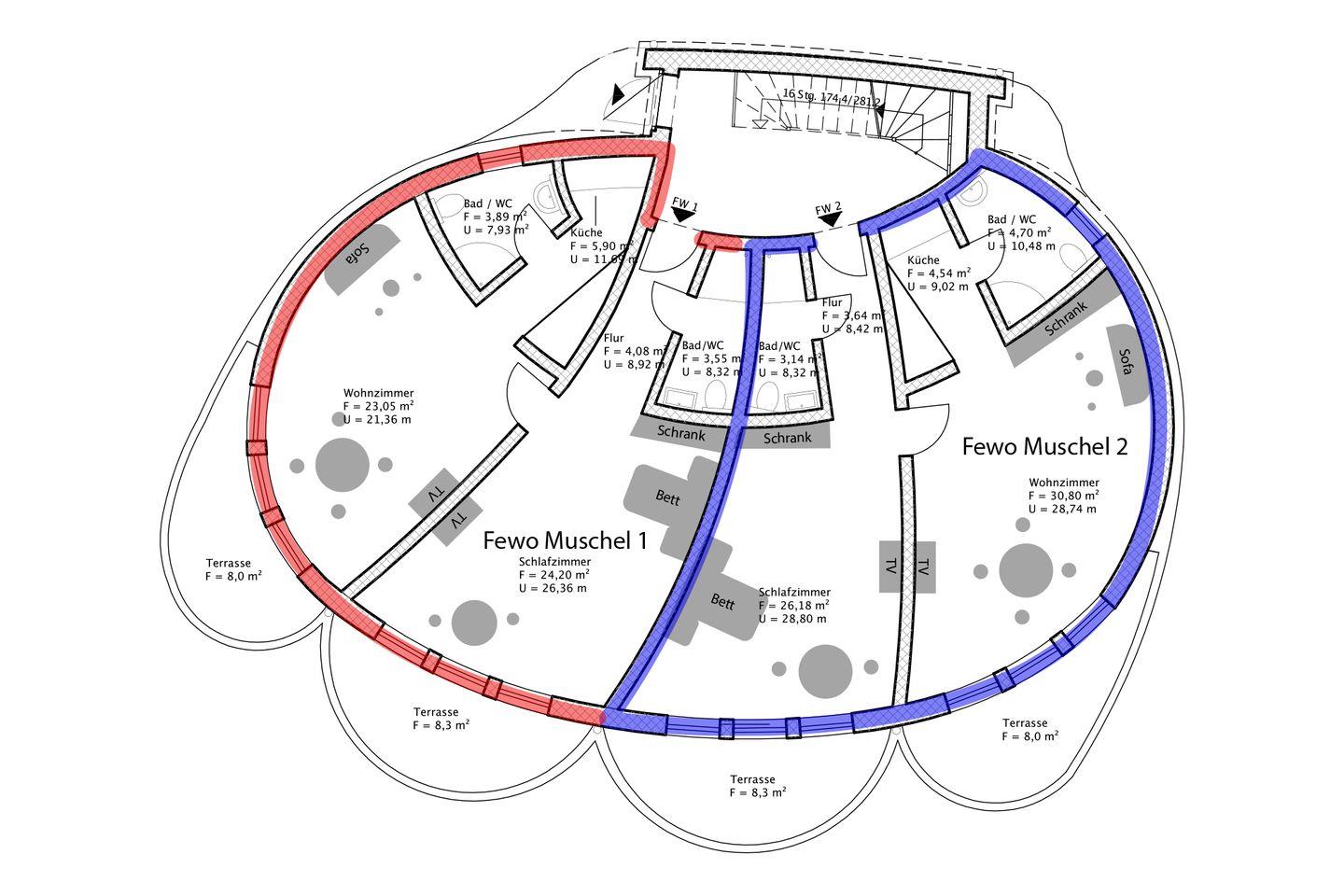 Die Unterkunft „Muschel 2“ befindet sich im Erdgeschoss des Hauses. Großzügige Räume, helle Farben und modernes Mobiliar machen diese Ferienwohnung zu einem besonderen Urlaubsdomizil. Vom Flur mit Garderobe kommst du direkt in das erste Schlafzimmer, dass mit einem großen Doppelbett, Kleiderschrank, Sitzgelegenheit, TV und bodentiefen Fenstern ausgestattet ist. Auch ein Badezimmer mit Dusche und WC kannst du vom Flur aus betreten. Durch eine Tür gelangst du in den großzügigen Wohn- und Schlafbereich. Die vollausgestattete Küchenzeile ist offen integriert und lädt mit Herd, Backofen, Geschirrspüler und Essbereich zum Kochen und Klönen ein. Das gemütliche Sofa kann ausgezogen werden und bietet mit 160 cm Liegefläche einen komfortablen Schlafplatz für bis zu zwei Personen. Abgerundet wird die neu modernisierte Ferienwohnung durch ein zweites Bad mit Dusche und WC.