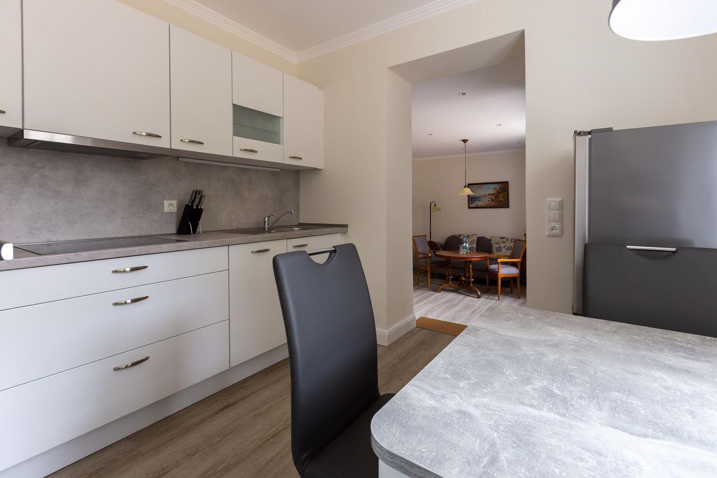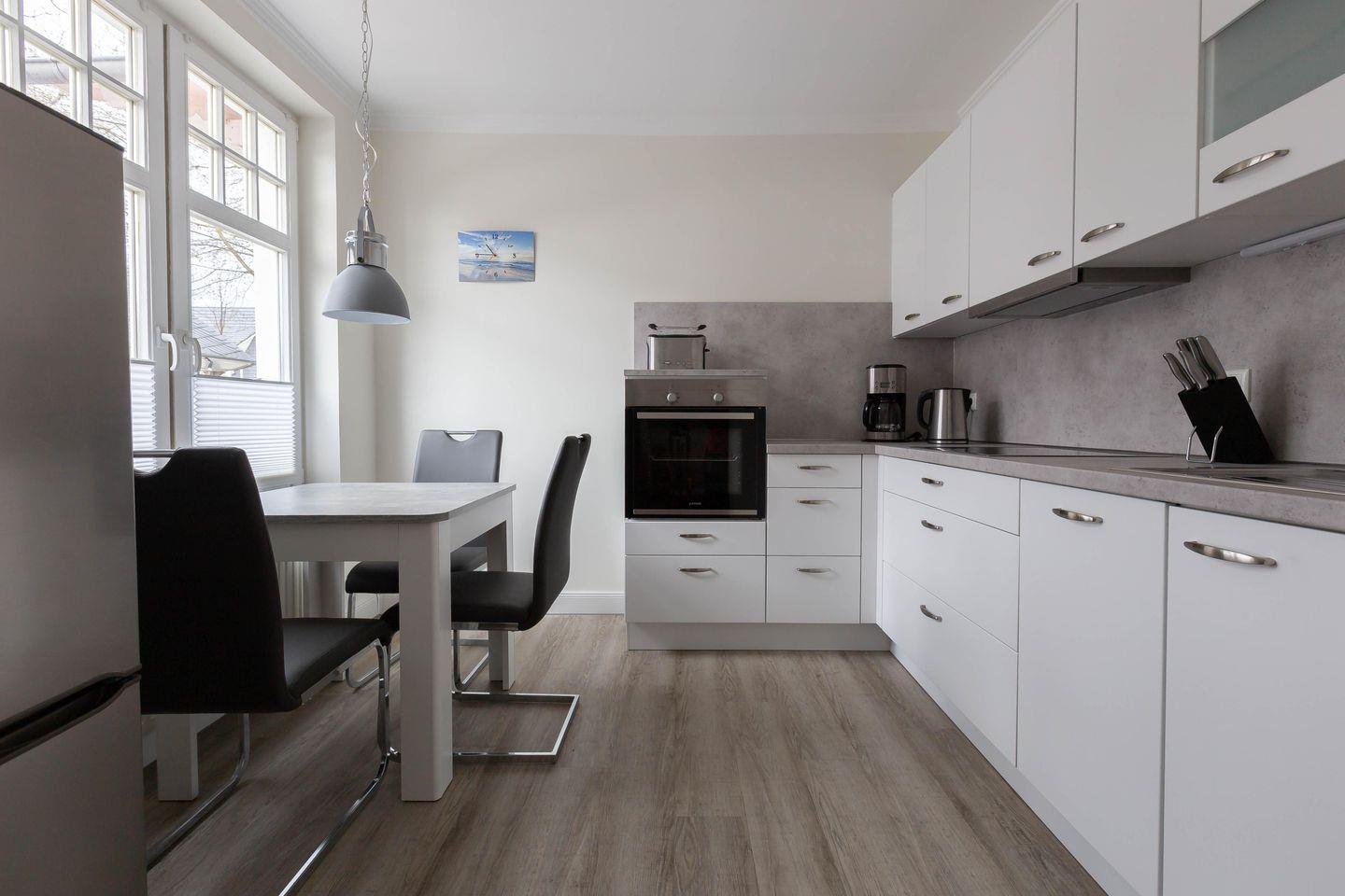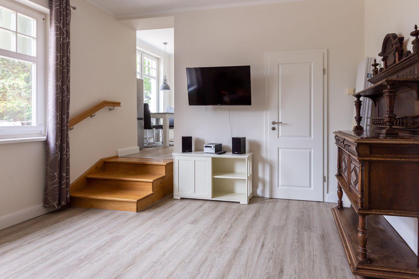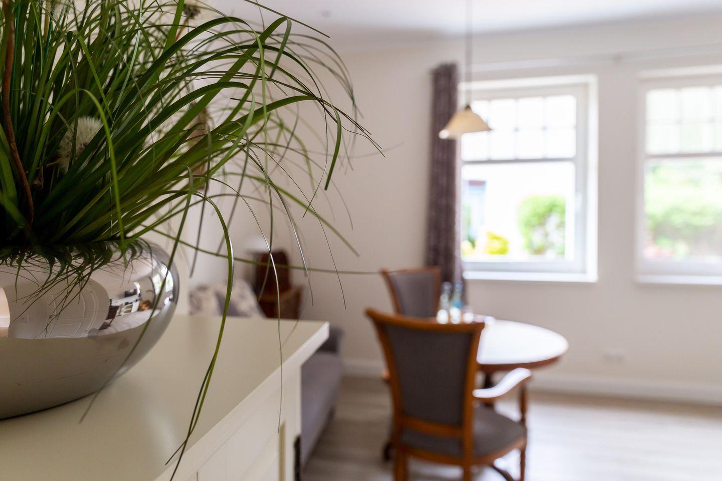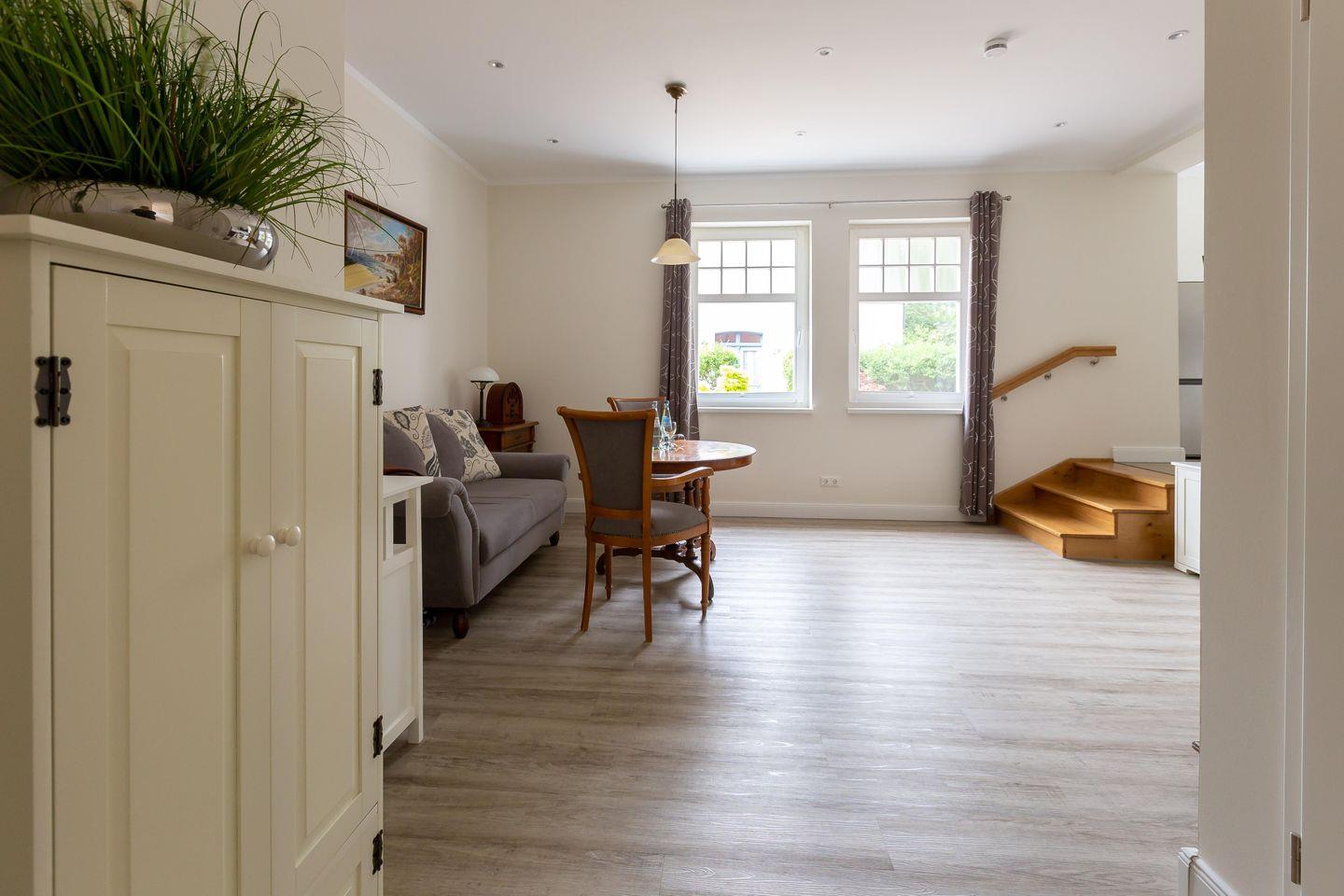Die Unterkunft „Strandläufer 1“ befindet sich im Erdgeschoss des Haupthauses Strandläufer. Großzügige Räume, helle Farben und ein Mix aus modernem Mobiliar und Möbeln im Stil der Gründerzeit machen diese Ferienwohnung zu einem besonderen Urlaubsdomizil. Vom Flur mit Garderobe gelangst du direkt in das großzügige und offen gestaltete Wohnzimmer mit gemütlicher Couch und TV. Dieses kann bei Bedarf ausgezogen werden und dient als Aufbettung für eine dritte Person. Direkt an den Wohnraum schließt sich die vollausgestattete Küche an und bietet mit seinem sonnigen Esstisch am Fenster alles was du zum Kochen und gemütlichen Beisammensein brauchst. Das Schlafzimmer ist mit einem hochwertigem Doppelbett und Kleiderschrank ausgestattet. Hier findest du garantiert die Ruhe und Erholung, die man sich im Urlaub wünscht. Für Wohlfühlkomfort sorgt auch das getrennte Badezimmer, dass Dusche und WC separiert.