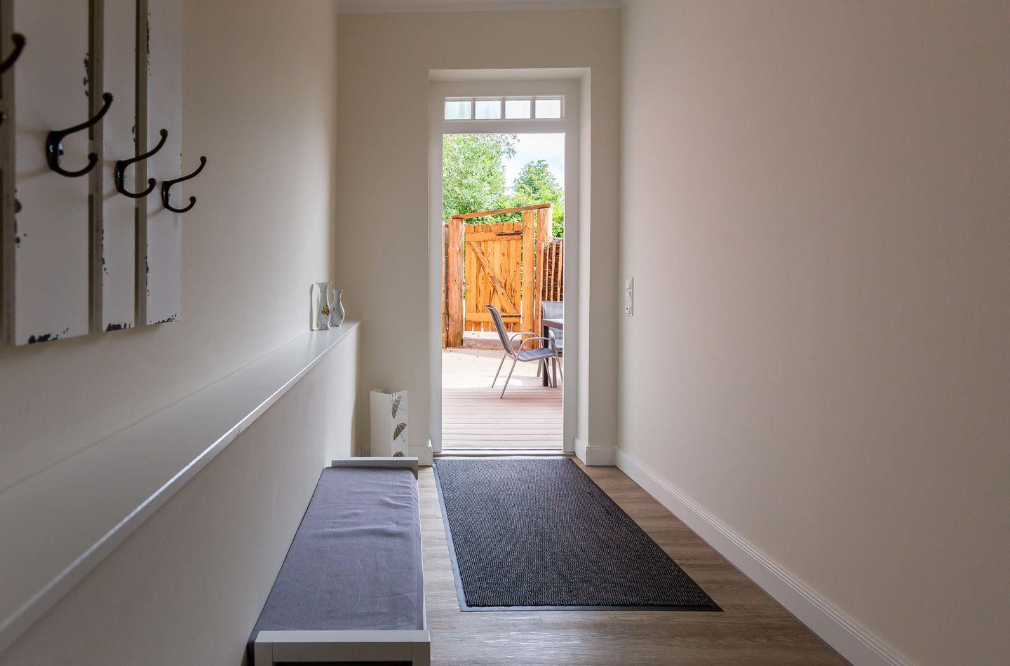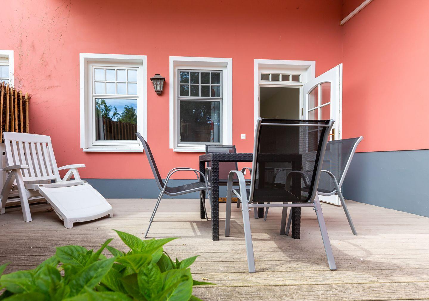 Im Außenbereich steht dir eine Terrasse mit Tisch und Stühlen zur Verfügung. Hier kannst du den Tag bei einem sonnigen Frühstück beginnen oder diesen bei einem lauschigen Sommerabend ausklingen lassen. Zur Ferienwohnung gehört außerdem ein PKW-Stellplatz.