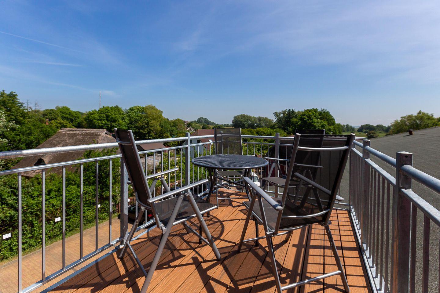 Im Außenbereich steht dir ein Balkon mit Tisch und Stühlen zur Verfügung. Der herrliche Ausblick wird dich begeistern. Denn hier kann dein Blick über die Reetdächer bis zum Bodden schweifen. Es ist der perfekte Platz, um einen der berühmten und lichtdurchtränkten Sonnenaufgänge zu beobachten, die so einmalig auf der Halbinsel sind.