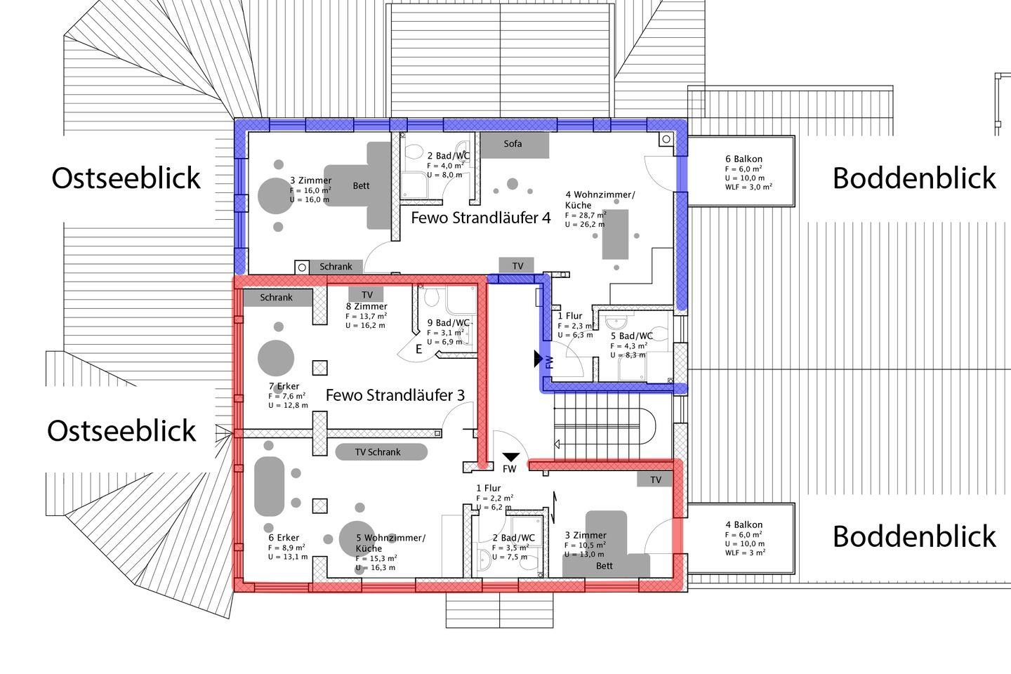 Die Unterkunft „Strandläufer 4“ befindet sich im zweiten Obergeschoss des Haupthauses Strandläufer und ist über den Seiteneingang zu erreichen. Großzügige Räume, helle Farben und ein Mix aus modernem Mobiliar und Möbeln im Stil der Gründerzeit machen diese Ferienwohnung zu einem besonderen Urlaubsdomizil. Vom Flur mit Garderobe gelangst du direkt in den offen gestalteten Wohn-und Küchenbereich mit Austritt auf den Balkon. Ob mit Familie oder Freunden, es gibt genügend Platz zum gemeinsamen Kochen und Klönen. Die gemütliche Couch im Wohnraum kann ausgezogen werden und dient als Aufbettung für bis zu zwei Personen. Ein weiteres Highlight bietet das Schlafzimmer in Richtung Ostsee. Hier genießt du einen traumhaften Blick auf das Meer mit seinen spektakulären Sonnenuntergängen. Ausgestattet mit einem großem Doppelbett, bekommst du garantiert den erholsamen Schlaf, den du dir im Urlaub wünschst. Für noch mehr Wohnkomfort sorgen die beiden Badezimmer mit Dusche und WC.