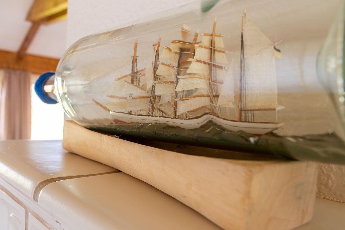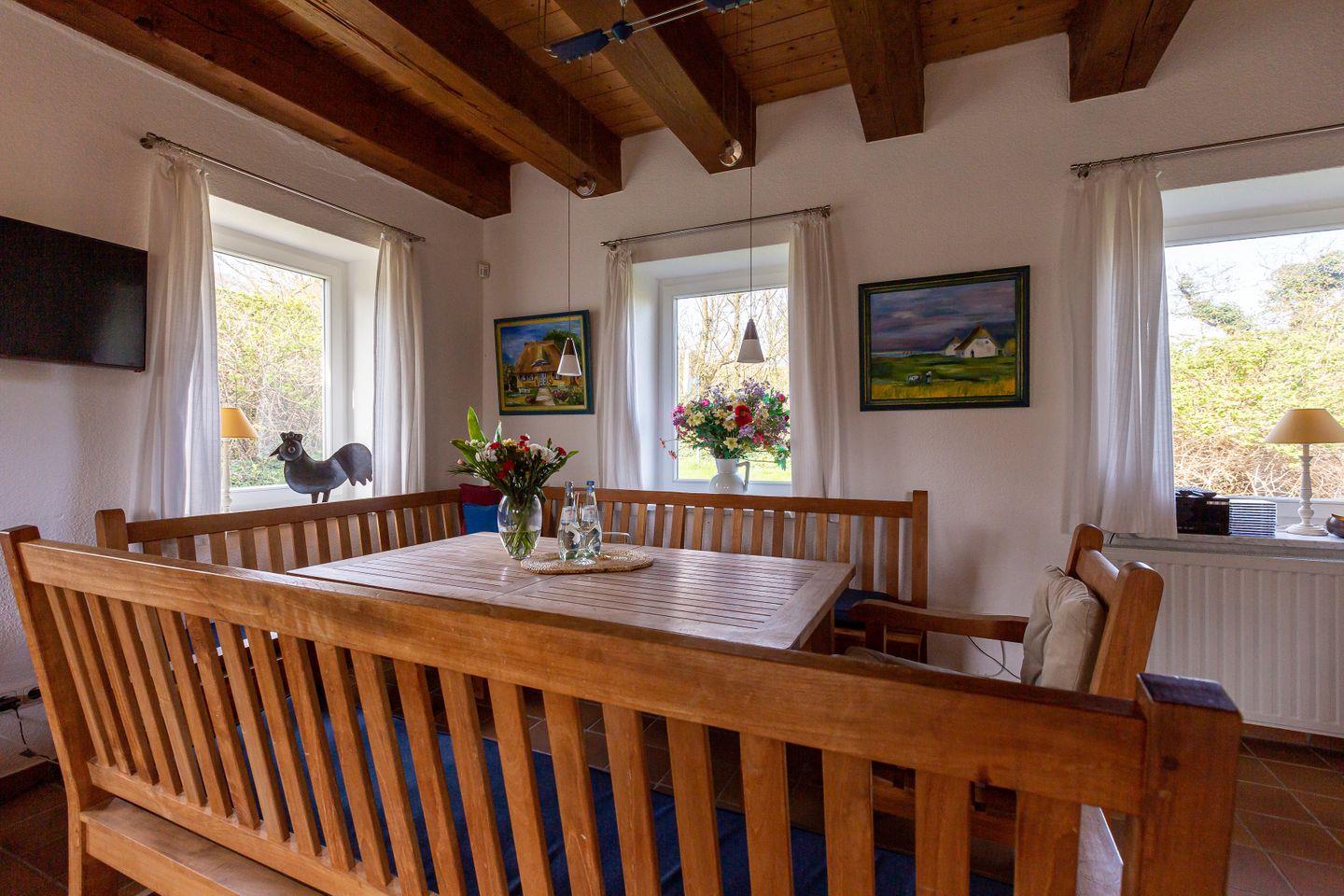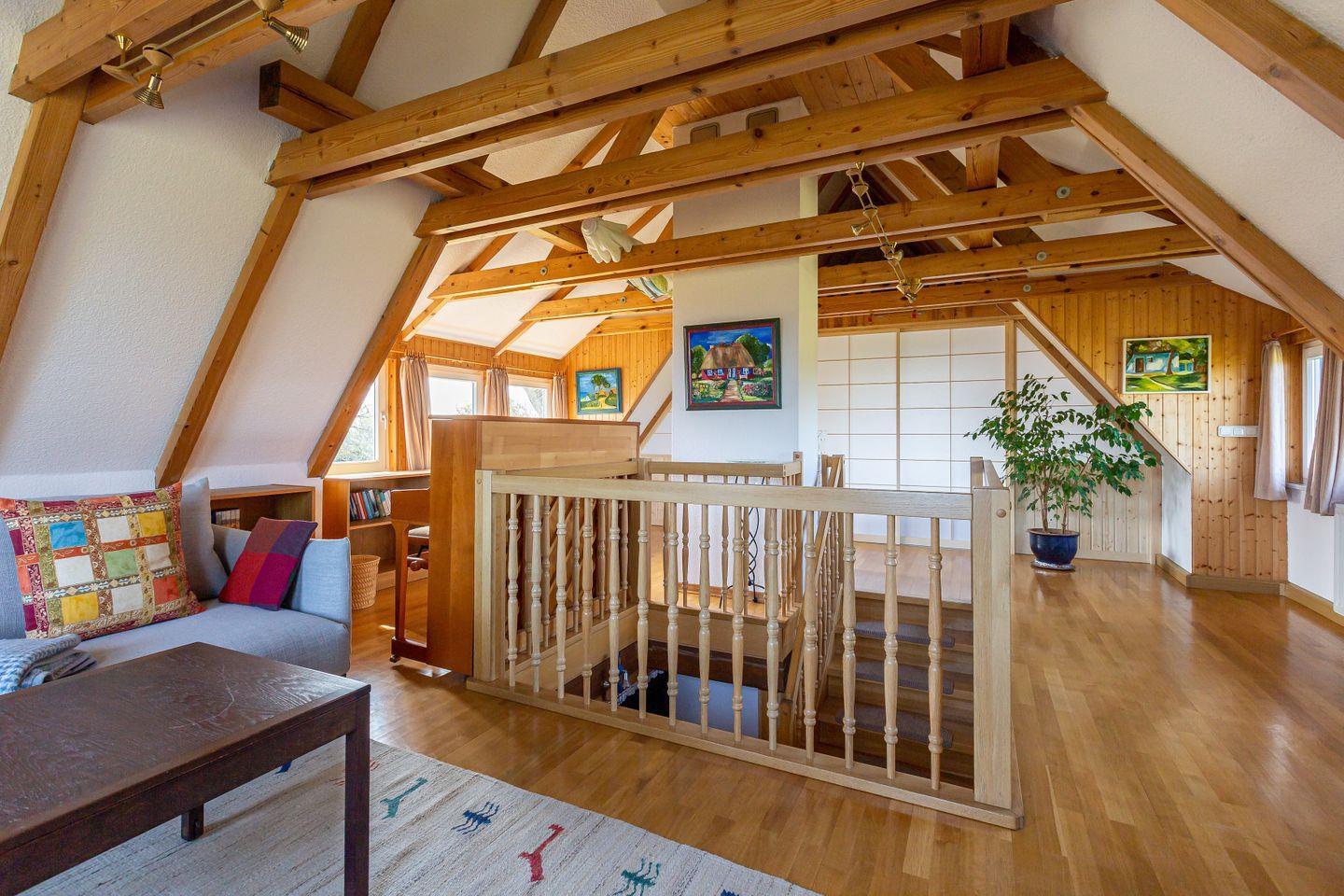 Durch die Darßer Tür und den kleinen Flur betritts du den großzügigen Küchenbereich. Es sind Besonderheiten wie die massiven Deckenbalken, der dekorative gekachelte Kamin und die sonnige Essecke, die den Raum so gemütlich machen. Dank der gut ausgestatteten Küche lässt es sich hier nach Herzenslust Kochen und Klönen. Von der Küche betritt man das Hauptschlafzimmer mit Doppelbett und großem Kleiderschrank. Der Blick aus dem Fenster zeigt die wundervolle Natur, hinter der sich die Ostsee versteckt. Hier kannst du garantiert gut schlafen, nicht zuletzt, weil das Rauschen des Meeres für die richtige Entspannung und innere Ruhe sorgt. Abgerundet wird das Erdgeschoss durch das Badezimmer, dass mit einer Dusche ausgestattet ist. Über eine Holztreppe gelangst du in den Wohnbereich des Hauses, der mit seinen Fachwerkbalken und dem maritimen Interieur viel Wärme und Gemütlichkeit ausstrahlt. Vom Sofa aus genießt du einen traumhaften Blick aufs Meer und die Reetdächer der alten Fischlandkaten. Ein Klavier zum Spielen steht ebenfalls bereit und bietet die passende Untermalung für spektakuläre Sonnenuntergänge, die du vom Wohnzimmer aus genießen kannst. Vom Wohnbereich durch eine japanische Shoji-Tür getrennt, befindet sich das zweite Schlafzimmer, ebenfalls mit einem Doppelbett und herrlichem Blick auf die weiten Wiesen.