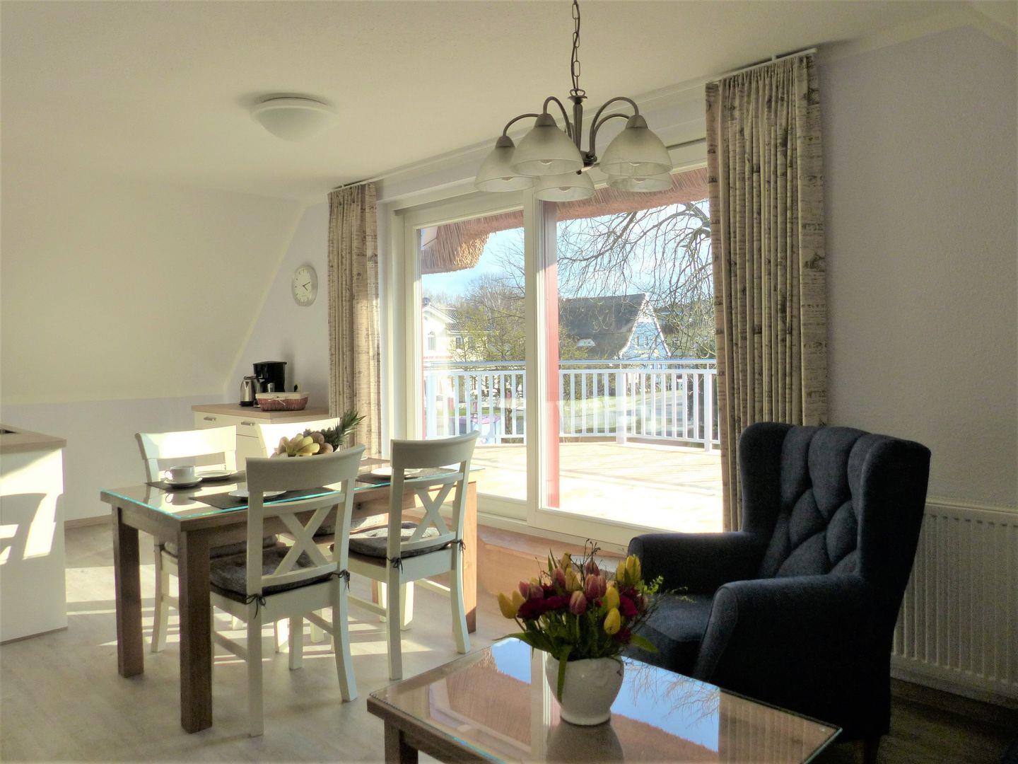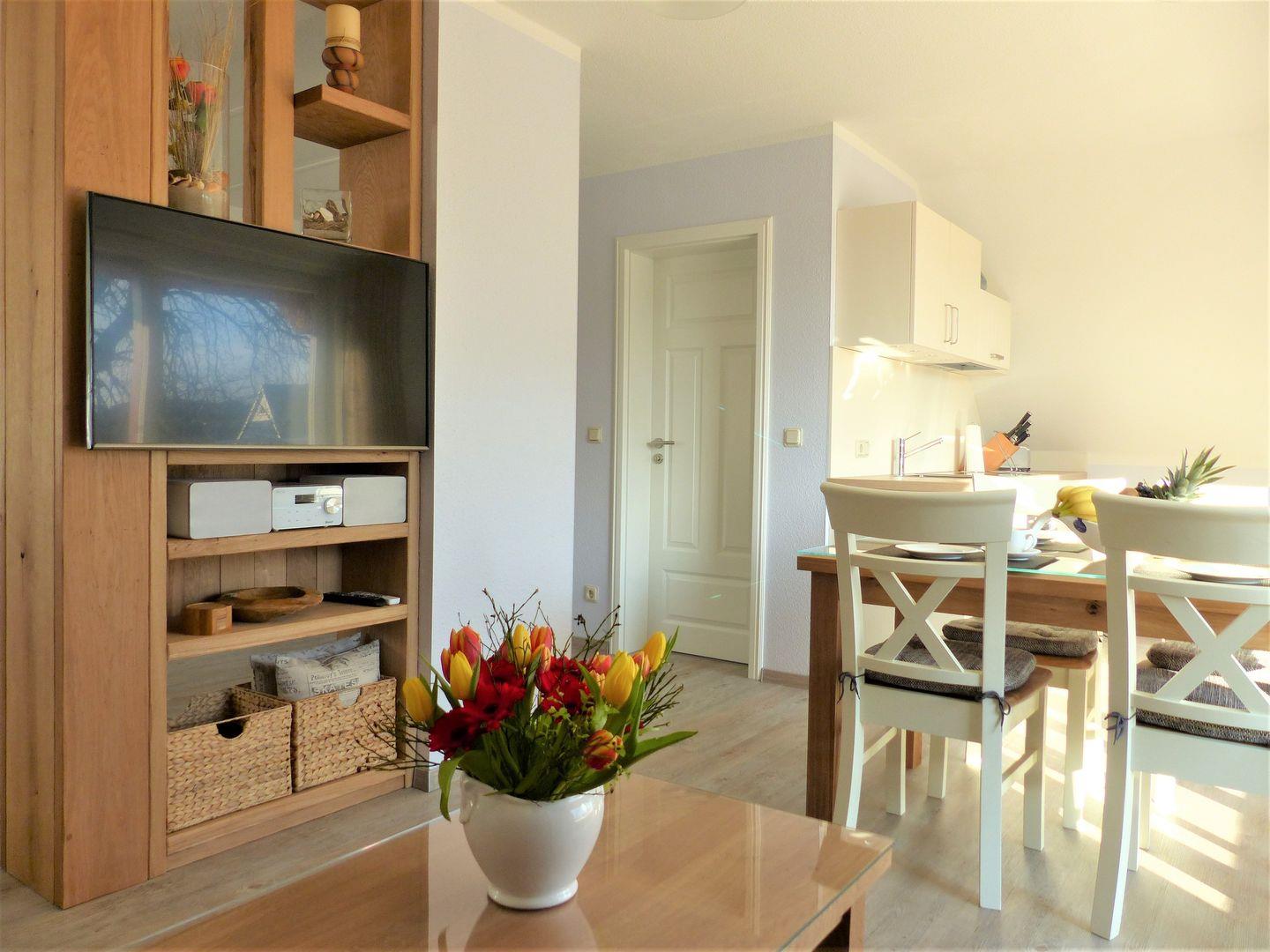 Das Wohnzimmer bildet den Mittelpunkt der Wohnung und lädt mit seiner gemütlichen Atmosphäre zum Verweilen ein. Die praktische Küchenzeile bietet alles, was Sie für die Zubereitung Ihrer Mahlzeiten benötigen – perfekt für ein gemeinsames Frühstück oder ein entspanntes Abendessen nach einem Tag am Strand.