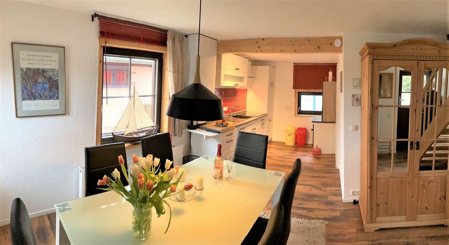 Die reetgedeckte Doppelhaushälfte ist ca. 75 m² groß und erstreckt sich über 3 Etagen. Im Erdgeschoß befinden sich die vollausgestattete Küche und das Duschbad. Über eine Holztreppe erreichen Sie dann im ers-ten Obergeschoß das Wohnzimmer und ein Schlafzimmer mit 2 Einzelbetten, bevor Sie über eine weitere etwas steilere Holztreppe dann das Schlafzimmer mit dem Doppelbett erreichen. Von Dort aus können Sie auch den Blick über den nahe gelegenen Bodden genießen. Vor dem Haus befindet sich eine kleine Terrasse. Haustiere und das Rauchen sind in der Wohnung nicht gestattet, jedoch gibt es WLAN für einen bequemen Internetzugang während des Aufenthalts. Ein PKW-Stellplatz befindet sich nicht weit vom Appartement entfernt.