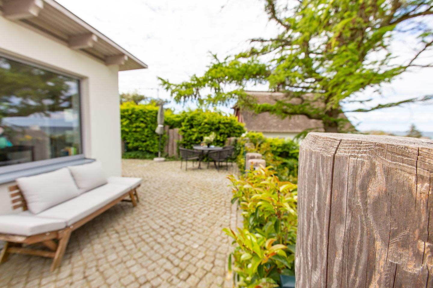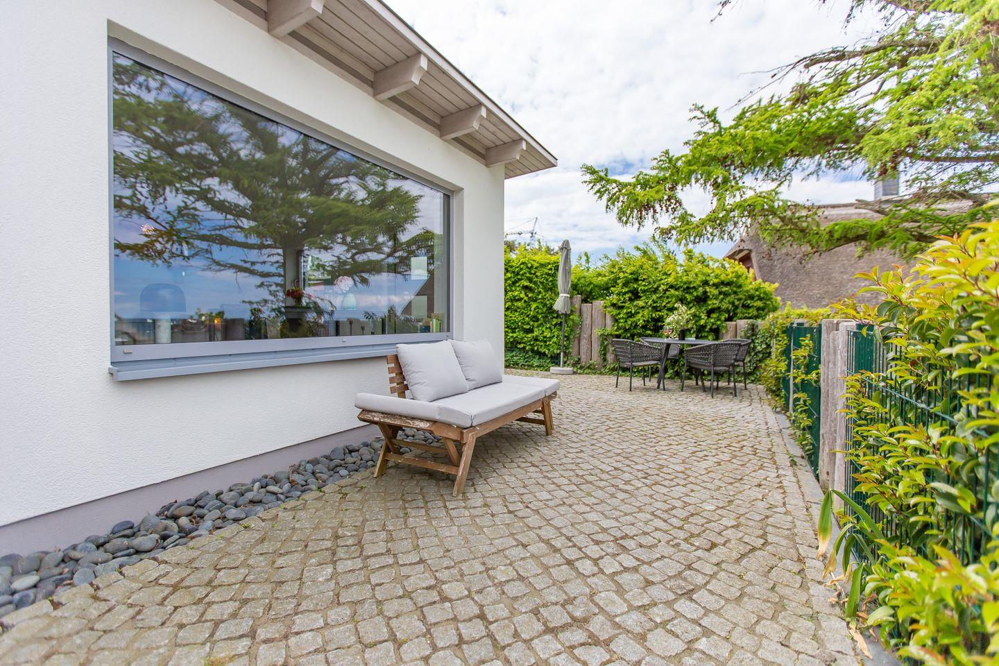 Atemberaubend ist der Blick auf’s Meer auch von der großzügigen L-förmigen Terrasse aus. Hier kannst du deinen ersten Kaffee am morgen und romantische Sonnenuntergänge am Abend genießen. Zum Ferienhaus gehört ein PKW-Stellplatz.