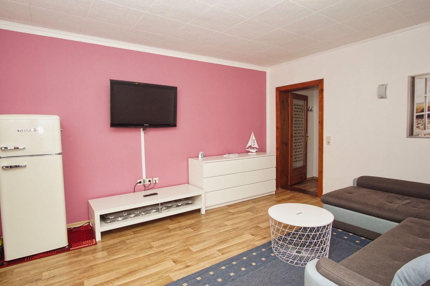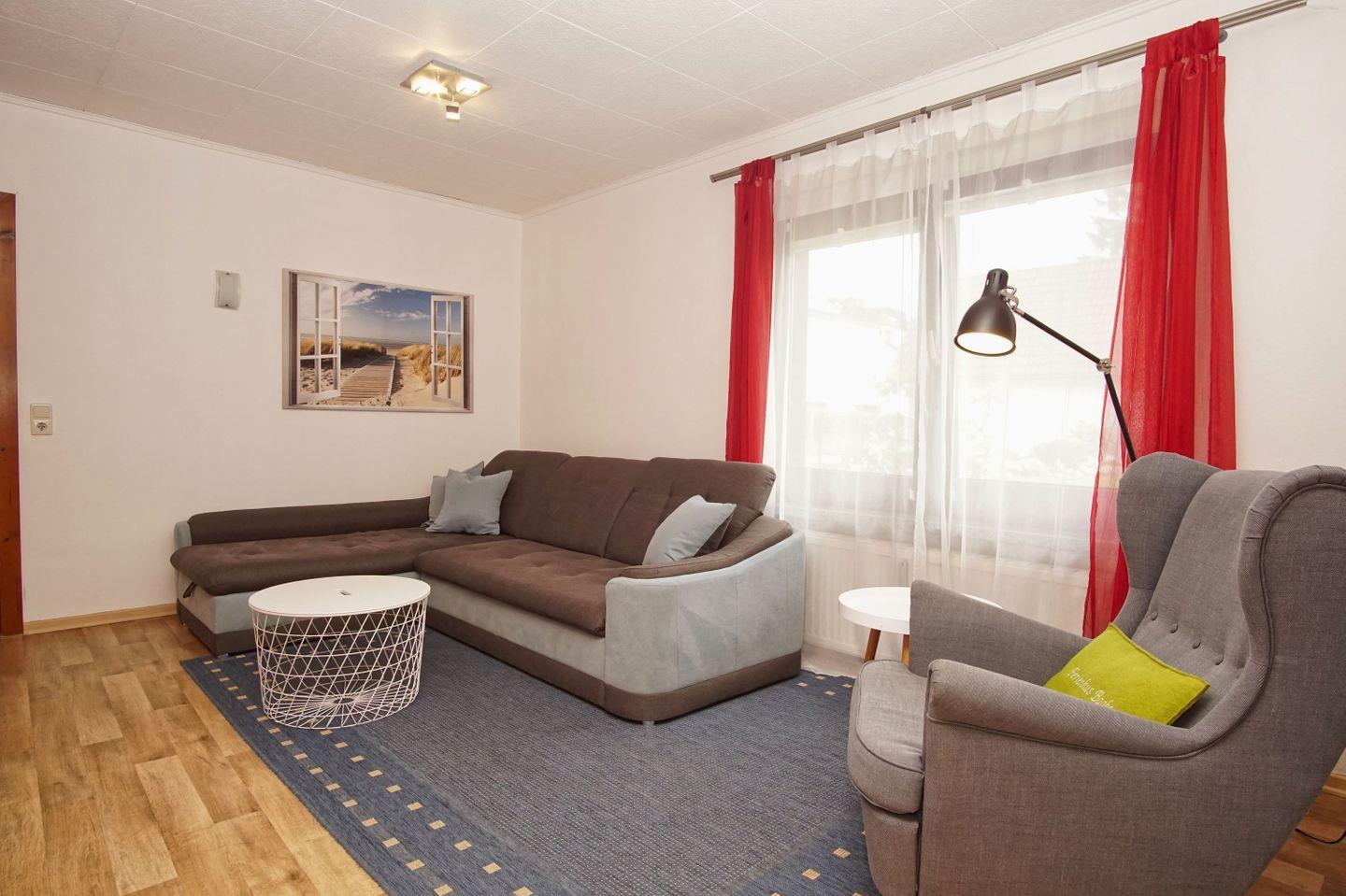 WOHNEN // Wohnraum mit bequemer Couch (Schlaffunktion), Sessel, Flachbild-TV ++