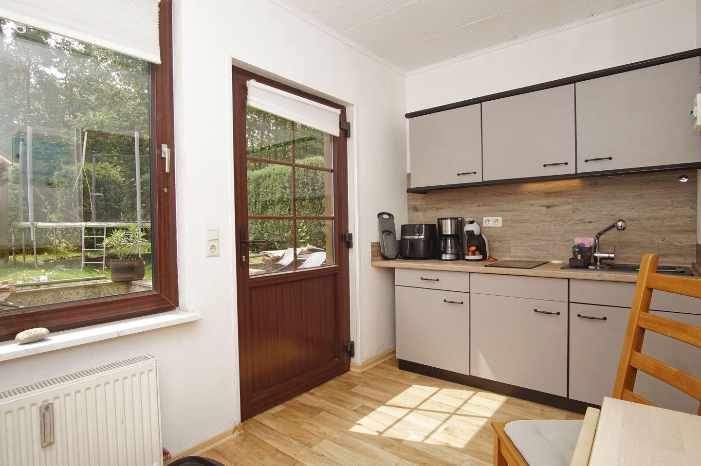 KÜCHE // sep. Küche mit Essbereich, 2-Platten Ceranfeld, Heißluftfritteuse, Kühlschrank mit Gefrierfach, Toaster, Wasserkocher, Kaffeemaschine, reichlich Besteck, Geschirr und Küchenutensilien ++
