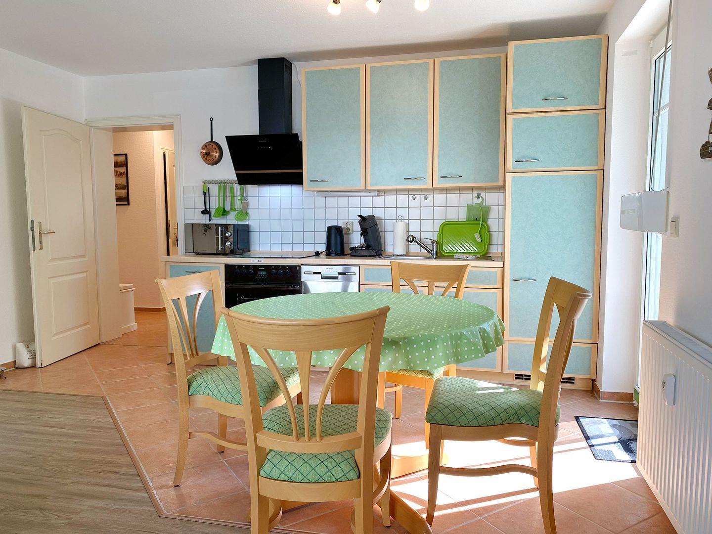 Die offene Küche ist in den Wohnbereich integriert und komplett ausgestattet mit Backofen, Ceranherd, Mikrowelle, Geschirrspüler , ect. Außerdem gibt es eine Pad-Kaffeemaschine, einen Eierkocher und ein Handrührgerät.