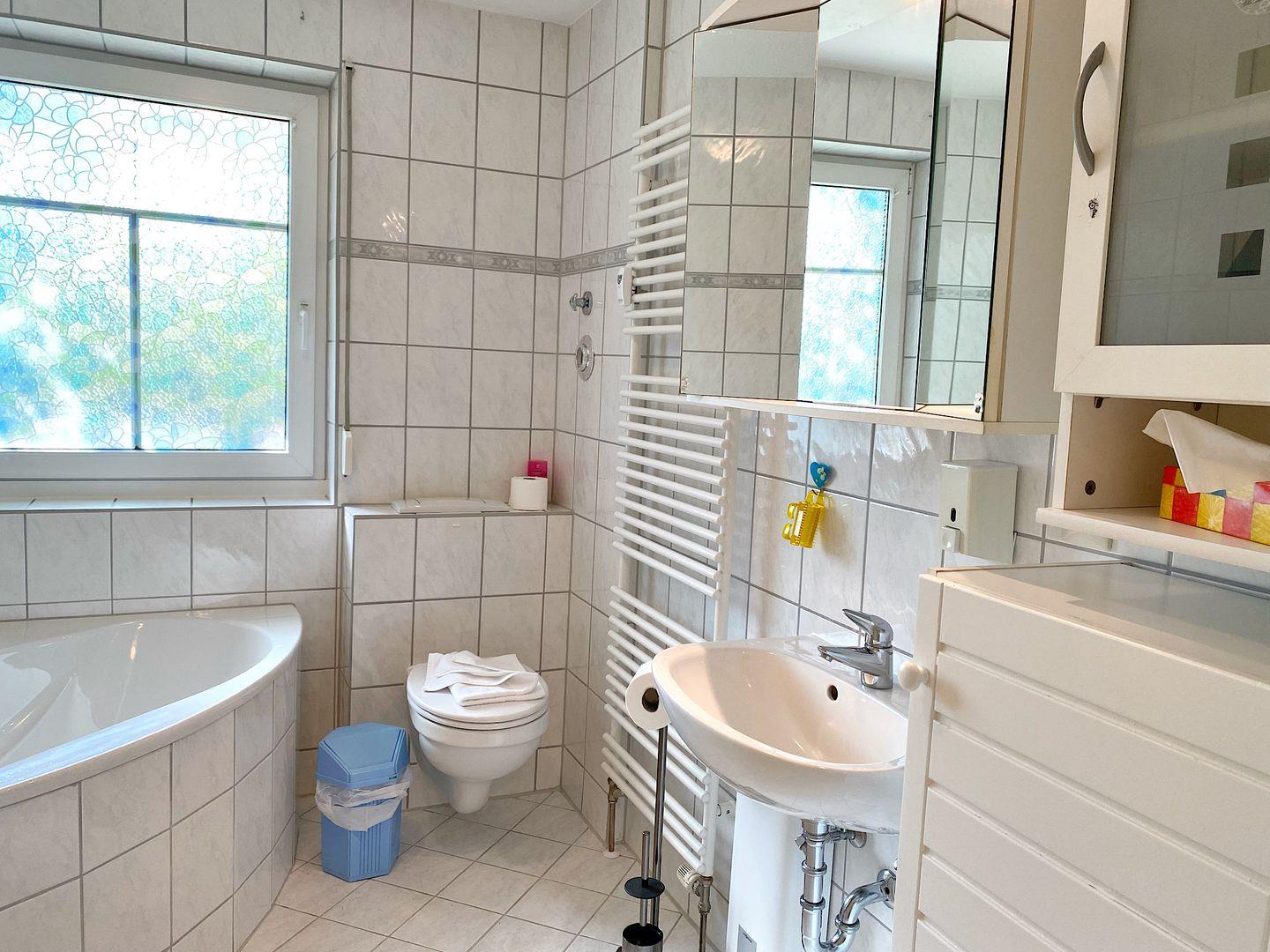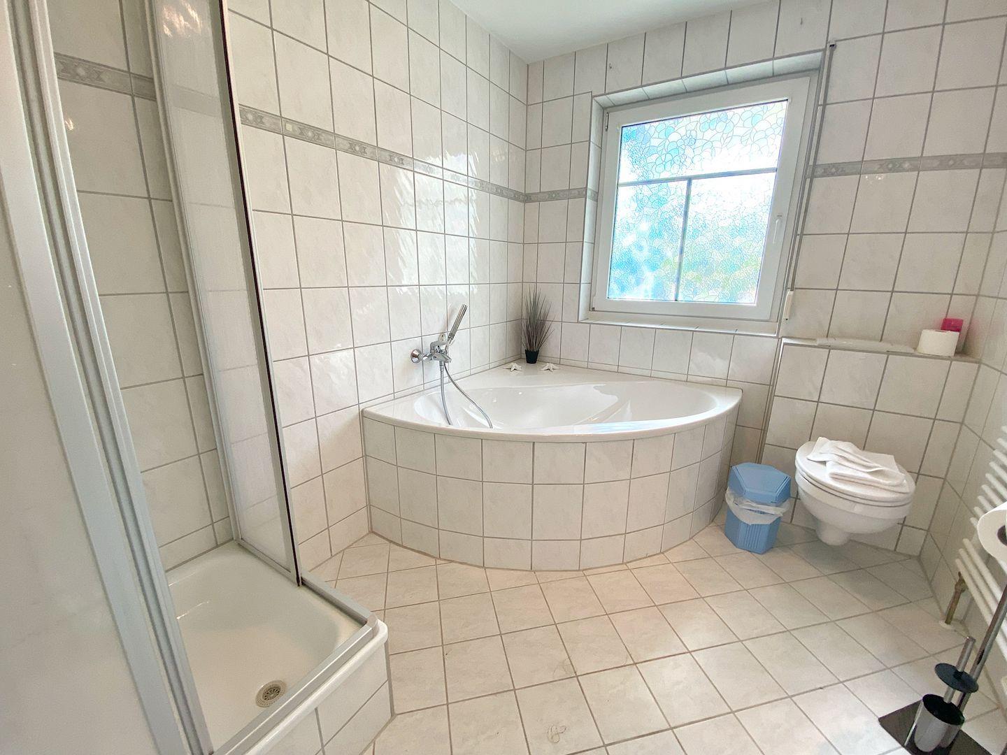 Das Bad bietet eine Eckbadewanne und eine Dusche.