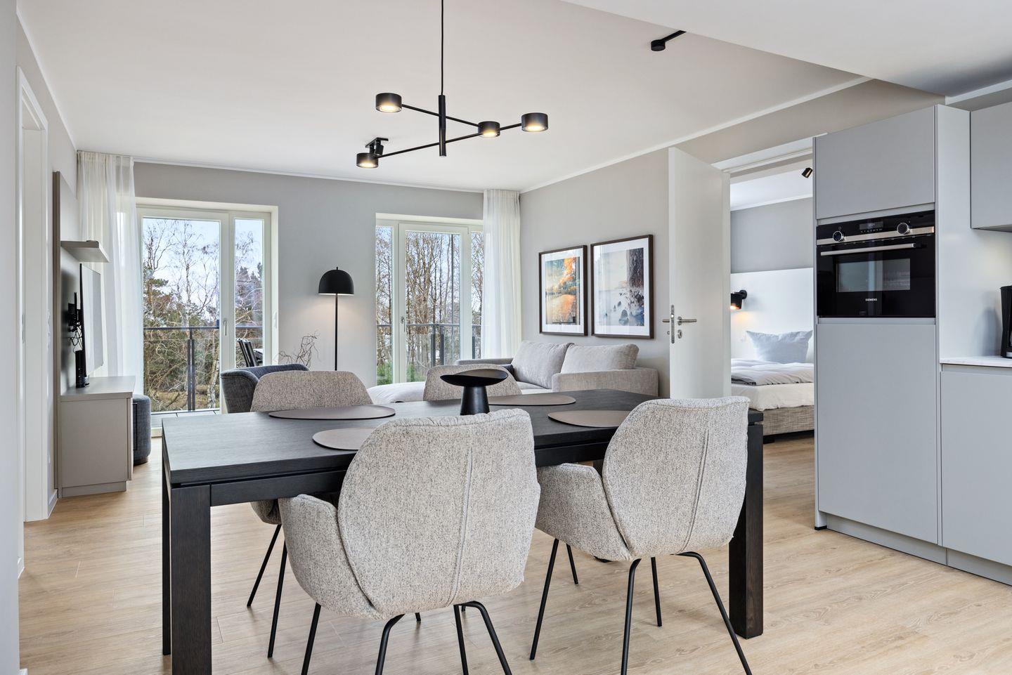 Das geschmackvoll eingerichtete Nichtraucher-Apartment verfügt über Fußbodenheizung, z.T. bodentiefe Fenster, kostenfreies WLAN und eine voll ausgestattete offene Küche mit Geschirrspüler, Kühlschrank mit Gefrierfach, Filterkaffeemaschine, Mixer, Toaster, Wasserkocher, Mikrowelle mit Backofenfunktion und 4-Felder Induktionsherd von BORA sowie über einen behaglichen und großzügigen Wohn-Essbereich. Im Wohnbereich befindet sich ein großer SMART-TV (55 Zoll).