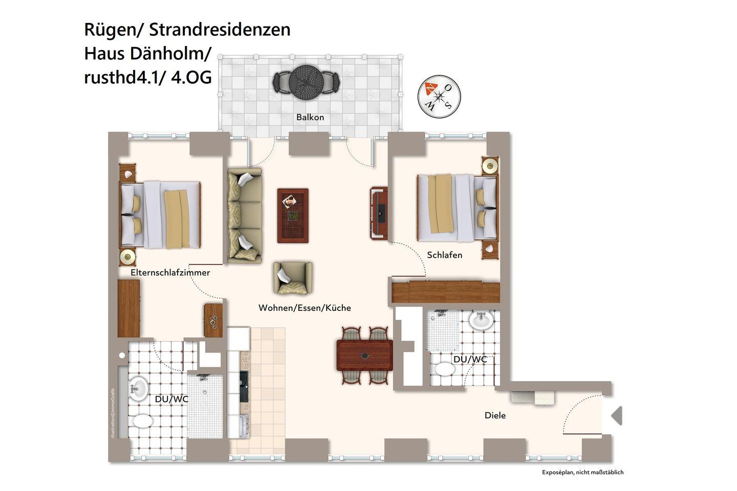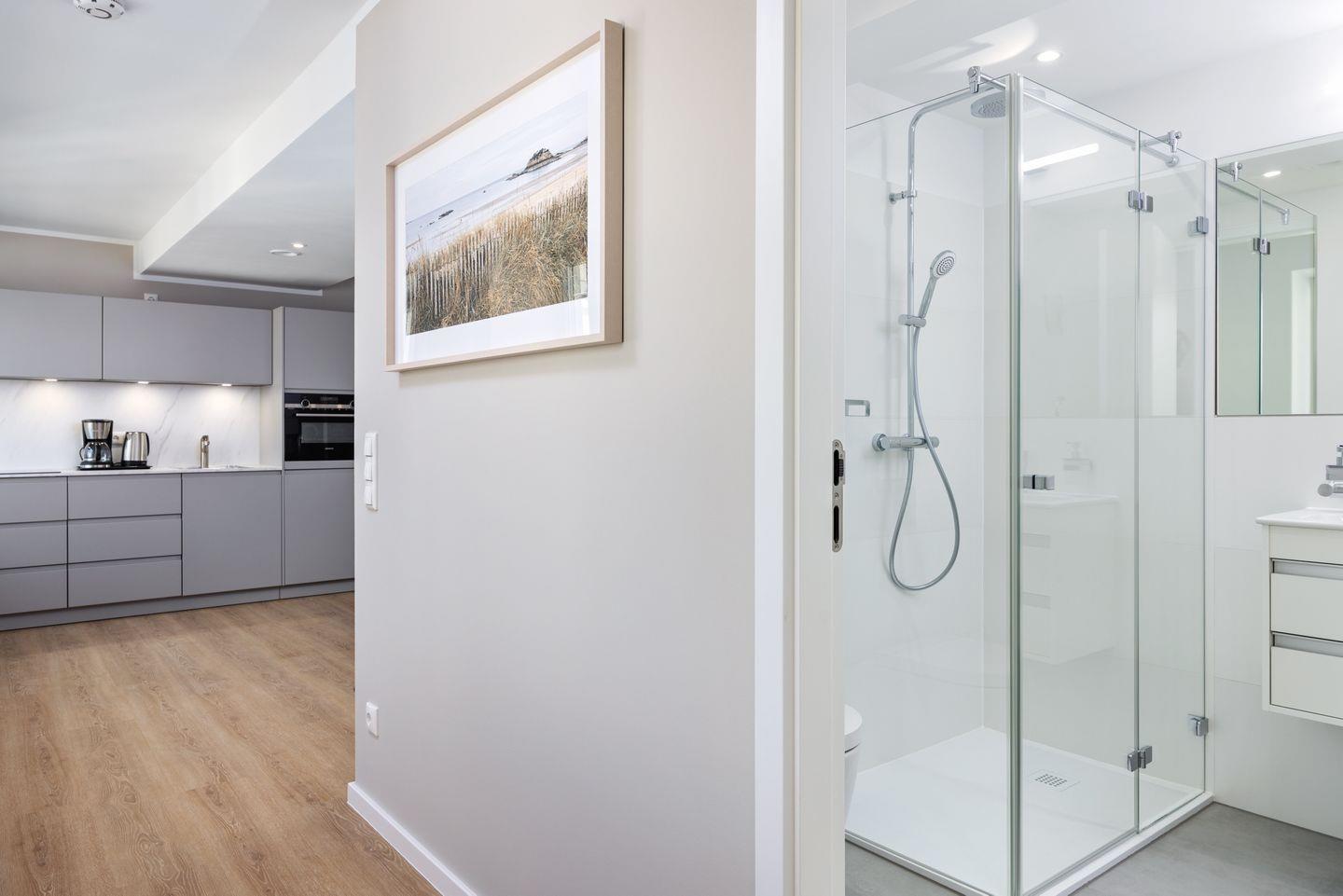Das lichtdurchflutete Apartment befindet sich in nordöstlicher Lage und befindet sich im vierten Obergeschoss des Hauses Dänholm. Die Ostsee liegt vor der Haustür - in nur 130 Metern erreicht ihr den feinsandigen, kilometerlangen Südstrand. In der Umgebung warten zahlreiche Ausflugsmöglichkeiten auf euren Besuch: Das Dokumentationszentrum Prora, das Prora-Zentrum, das Oldtimer-Museum Rügen, das NVA-Museum Rügen, die Galileo Wissenswelt Rügen, der Kletterwald Binz-Prora und das Naturerbe Zentrum Rügen mit dem Baumwipfel-Pfad sowie das beliebte Karls Erlebnis-Dorf in Zirkow. Fußläufig befinden sich zwei Bäckereien, einige Bistros sowie ein Restaurant, kleine Mode- und Souvenirgeschäfte als auch ein Fahrradverleih. Eine Segelschule befindet sich in ca. 3 km Entfernung. Im nahe gelegenen Dormero Strandhotel (ca. 800 m) könnt ihr Tagestickets erwerben und den Pool, die Sauna und den Fitnessbereich nach Herzenslust genießen.
