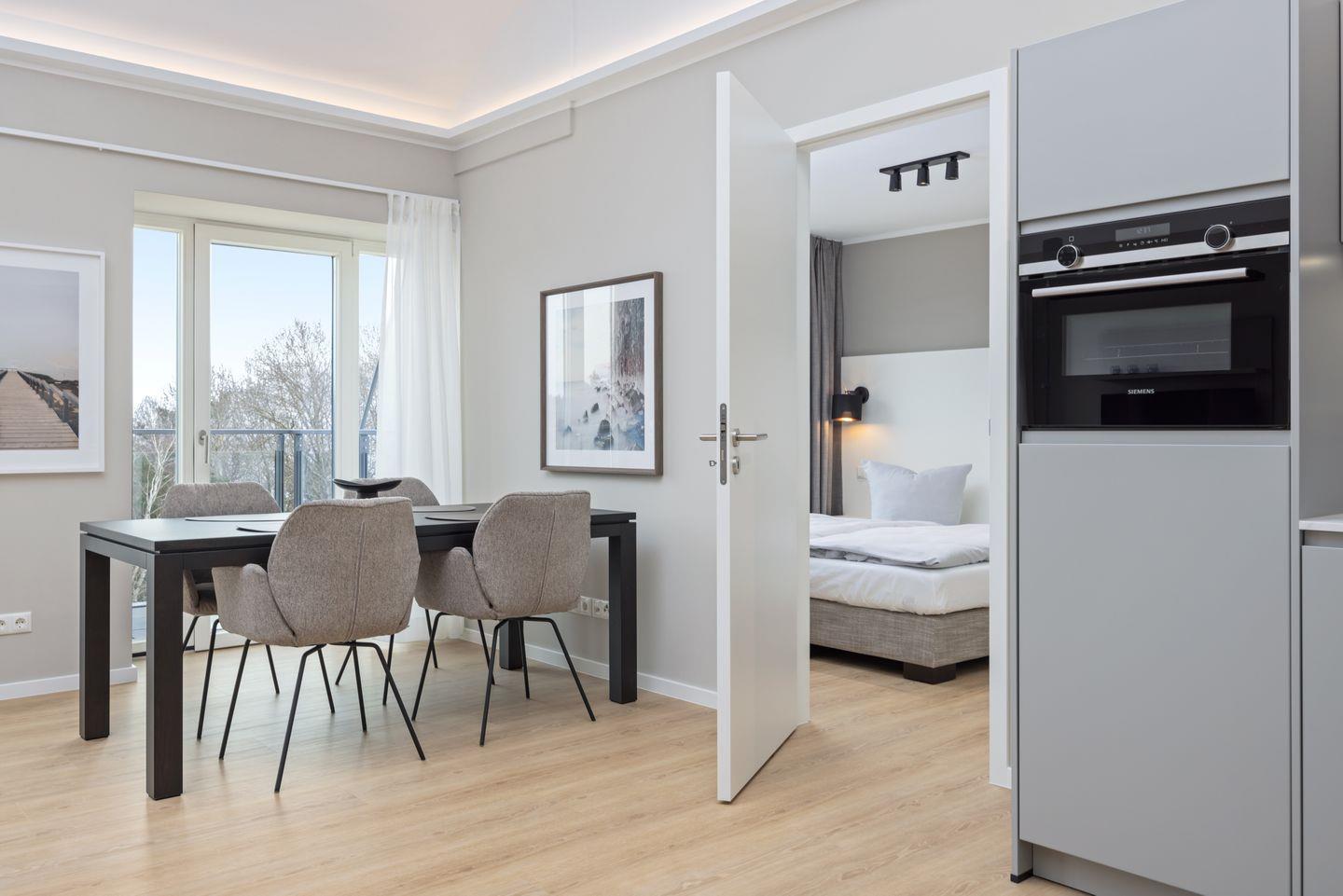 Das geschmackvoll eingerichtete Nichtraucher-Apartment verfügt über Fußbodenheizung, z.T. bodentiefe Fenster, kostenfreies WLAN und eine voll ausgestattete offene Küche mit Geschirrspüler, Kühlschrank mit Gefrierfach, Filterkaffeemaschine, Mixer, Toaster, Wasserkocher, Mikrowelle mit Backofenfunktion und 4-Felder Induktionsherd von BORA sowie über einen behaglichen und großzügigen Wohn-Essbereich. Im Wohnbereich befindet sich ein großer SMART-TV (55 Zoll) und eine Doppelschlafcouch (1,60 x 2,00 m).
